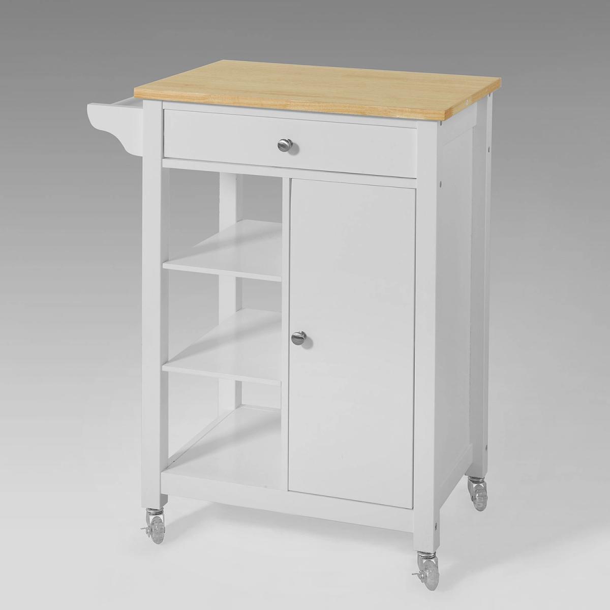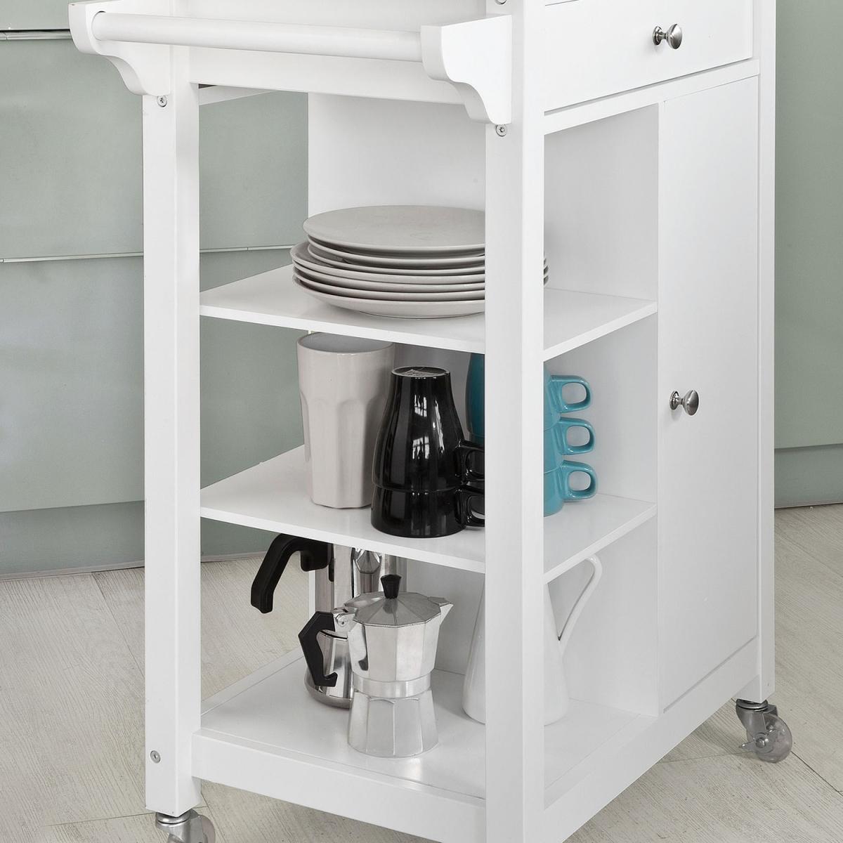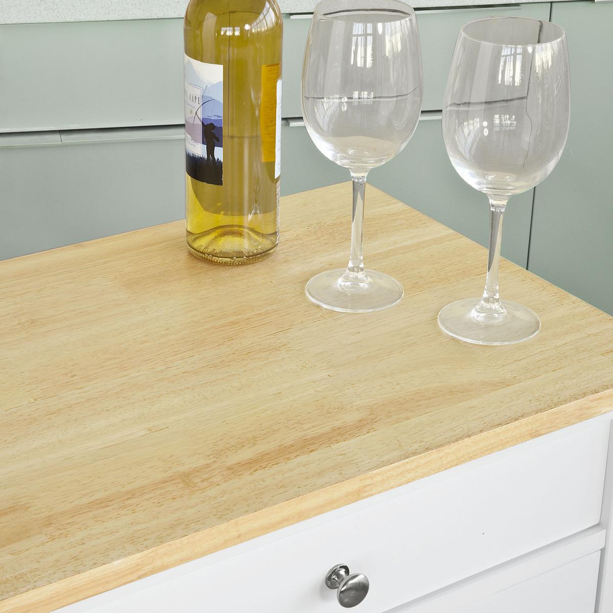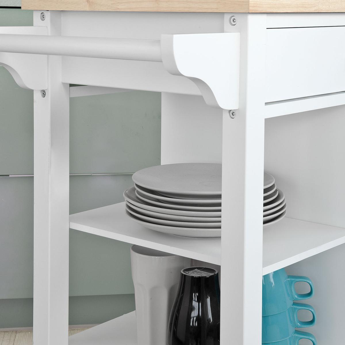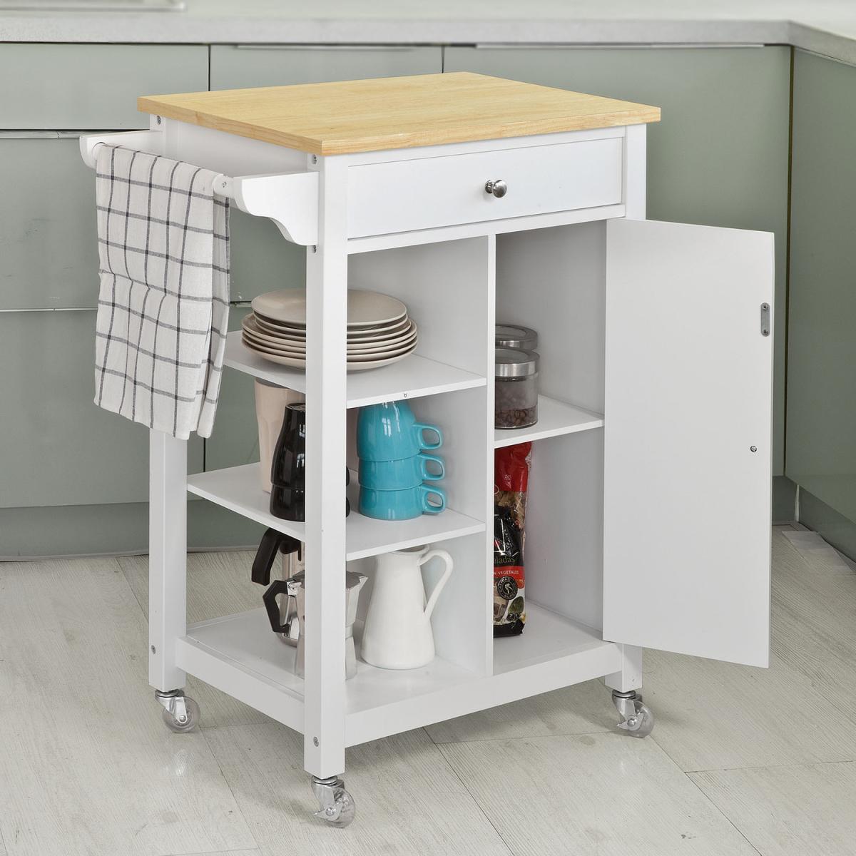 Space-saving wood kitchen trolley offers a lot of storage space for various utensils in your kitchen. With 1 worktop, 1 drawer, 1 cupboard, 3 storage shelves, 1 towel rail, 4 wheels and 2 with brake. Food can be prepared or kitchen appliances can be placed on the rubberwood work surface. The kitchen trolley has four large, robust wheels on which the kitchen trolley can be easily moved on any surface. This kitchen trolley is a versatile all-rounder and can be used throughout the home. It looks good in any room, no matter where you want to use it. Item comes in a flat pack and requires self-assembly. Detailed instructions supplied.