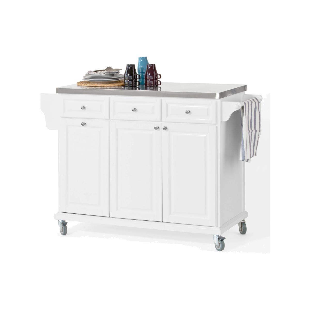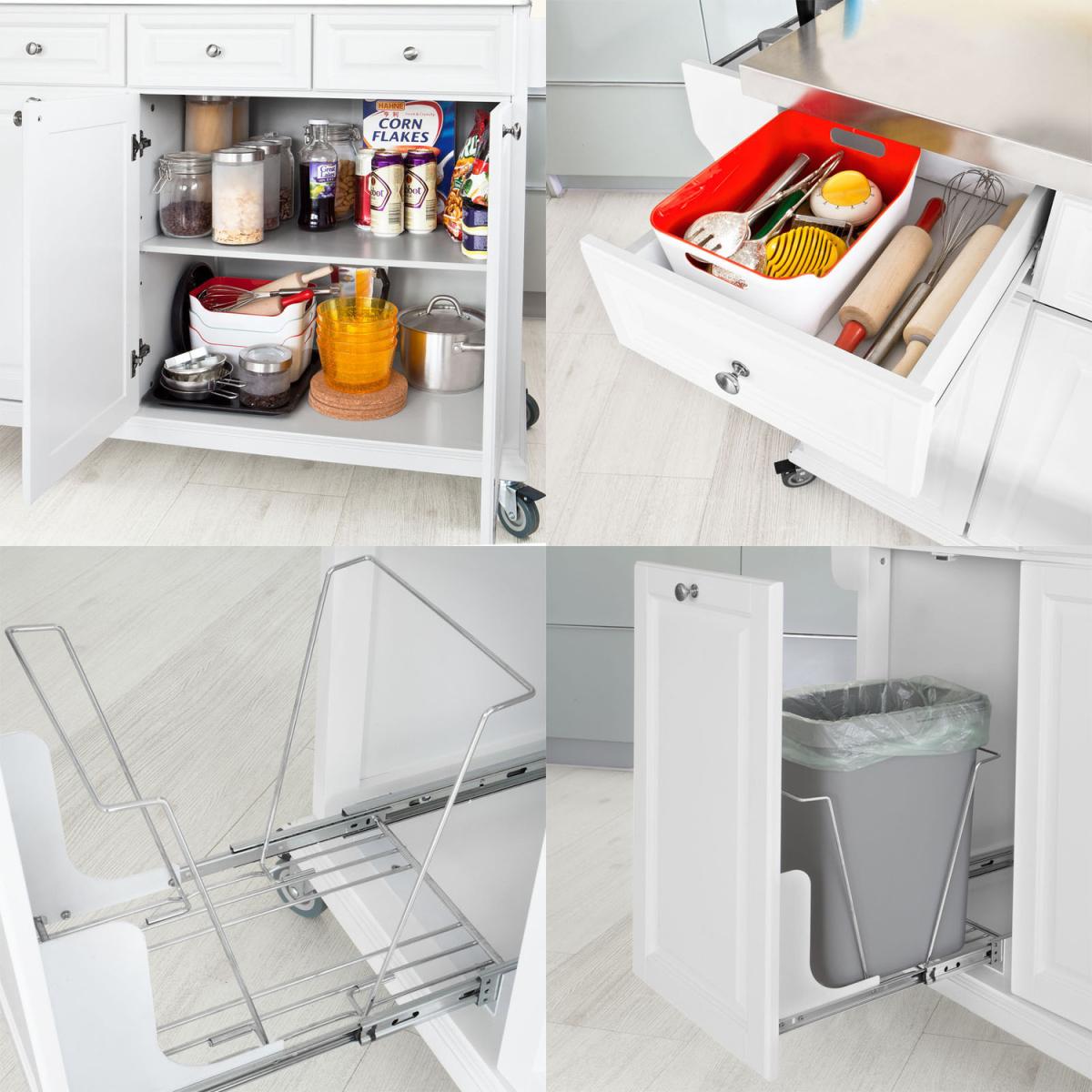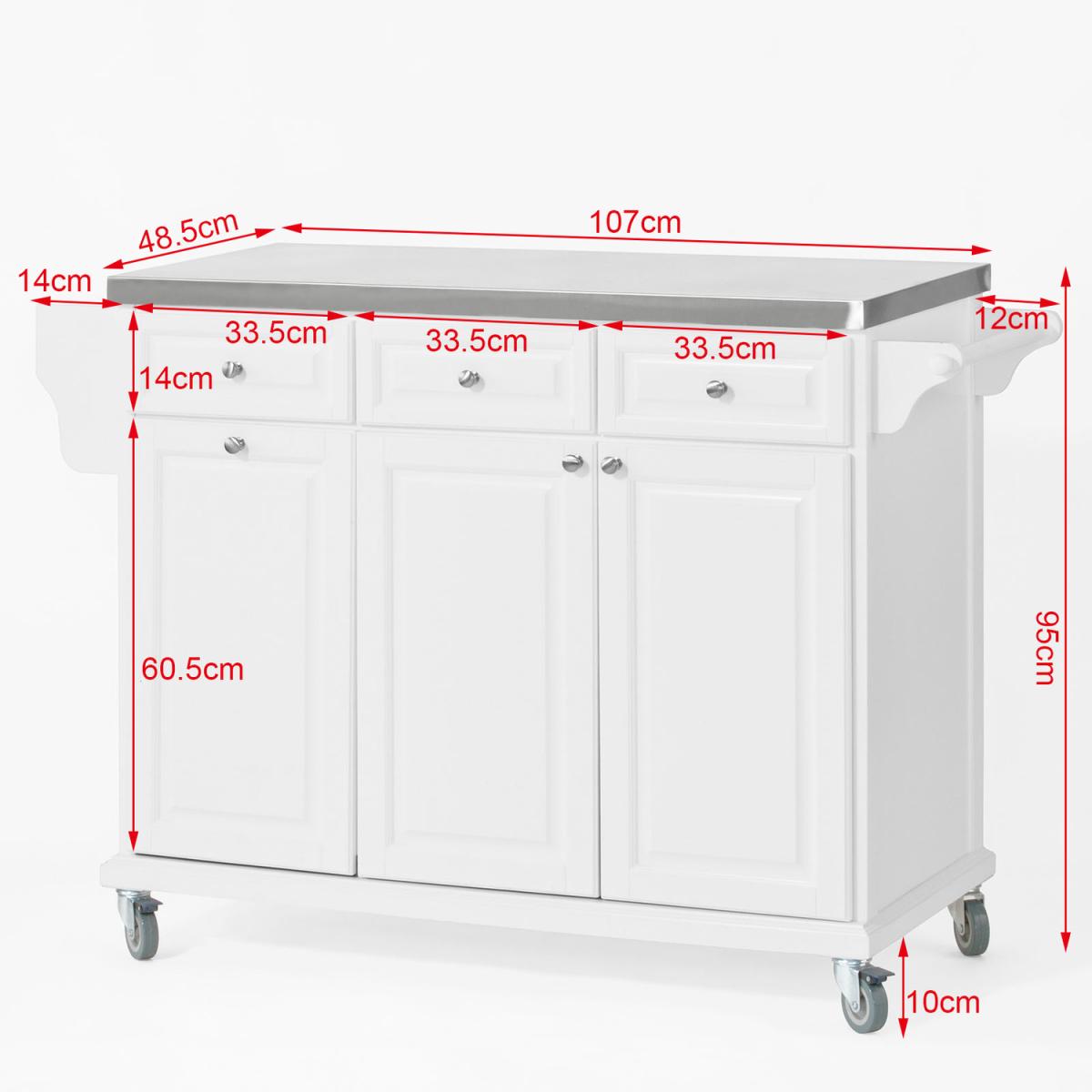Brand New Luxury Kitchen Cart is designed for longevity. Super Convenient Kitchen Storage Cabinet is perfect for the kitchen or other room of your house needing some extra storage. Included 1 stainless steel worktop, 3 drawers, 1 storage cabinet in two floors, 1 trash storage cabinet, 1 towel rail, 1 side storage rack and 4 castors. 1 Big Cabinet with an Adjustable Shelf. 1 Deep Cabinet for Rubbish Bin. 4 Rubber Wheels, Two with Brake. Item comes in 2 flat packs and requires self-assembly. Detailed instructions supplied. We are sorry we can not guarantee both packs are delivered at the same time. Please start to assemble after both packs are delivered.