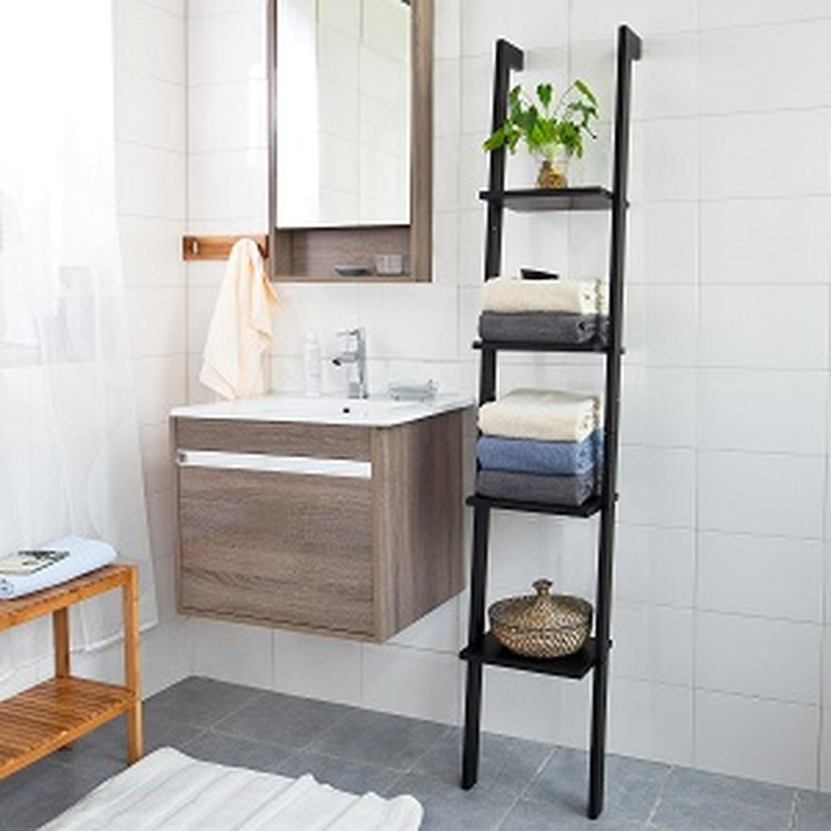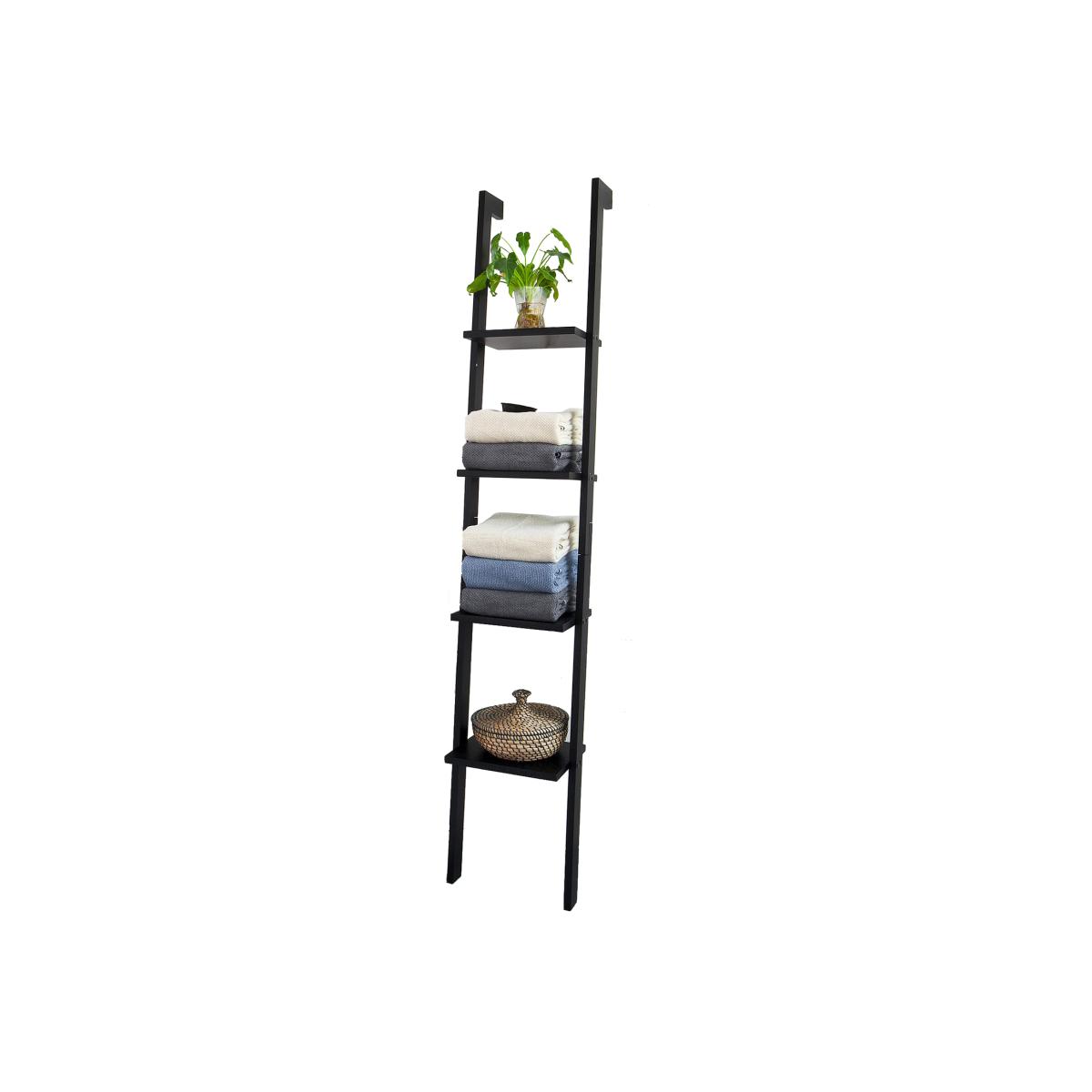 Modern 4 level ladder style shelf. Made from MDF. The simple design makes the shelf suitable for a variety of locations. (Also suitable for use in bathrooms) Provide enough storage space for all your display requirements. Before installation, ensure the supporting wall is of appropriate construction. Item comes in a flat pack and requires self-assembly. Detailed instructions supplied.