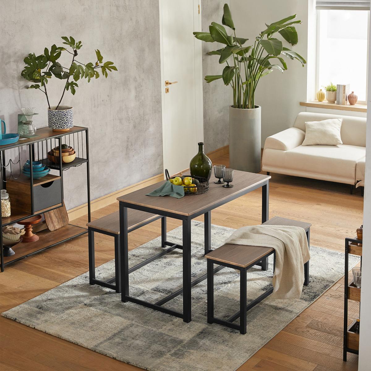 3 Pieces Dining Set- one table and two benches - is the perfect addition to any family home. MDF tops with wooden effect. Black powder coated steel frame. Sturdy and durable. The two benches can be placed under the table when not in use, saving space and keeping things out of the way. An excellent solution for the kitchen, dining room and restaurant. Practical and fashionable, this space saving dining set will provide a functional as well as relaxing place to eat and drink with friends and family. Item comes in a flat pack and requires self-assembly. Detailed instructions supplied.