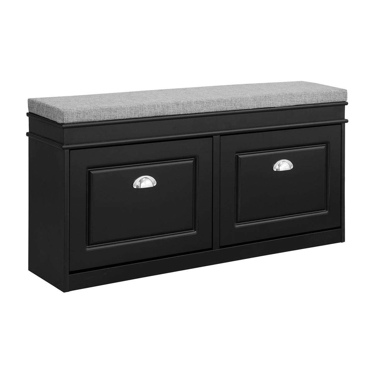Modern design shoe cabinet with soft padded cushion, good choice for hallway, living room and bedroom. It consists of storage for several shoes in two handy flip down sections beneath cushioned seat area. There is one board in each flip-drawer, which is removable for setting distance due to different sizes of shoes. The seat cushion which is removable is ideal for comfortable sitting while putting on and taking off shoes. This shoe cabinet will blend perfectly with your modern or traditional decor. Item comes in a flat pack and requires self-assembly. Detailed instructions supplied.