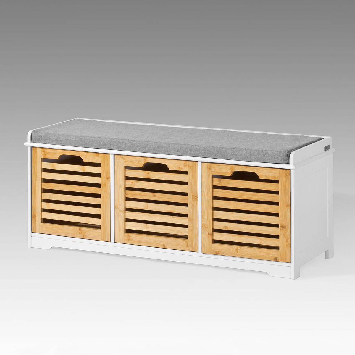 Modern design 3 drawers bench with soft seat cushion, good choice for hallway and living room. The padded seat which is removable is ideal for comfortable sitting while putting on and taking off shoes. 3 drawers provide ample storage space for shoes, boxes, books, magazines, etc. In addition, they can be pulled out completely as a great storage solution.
