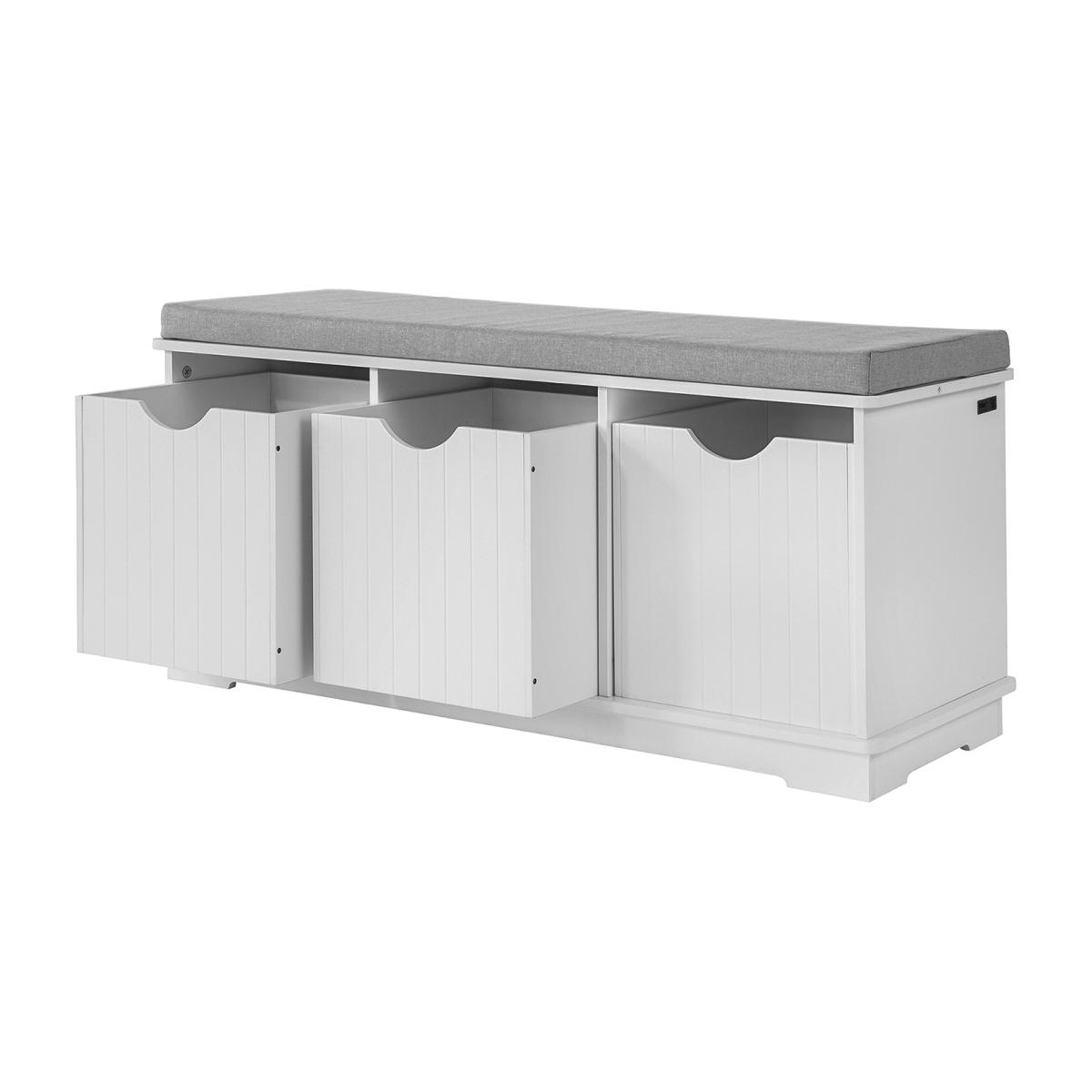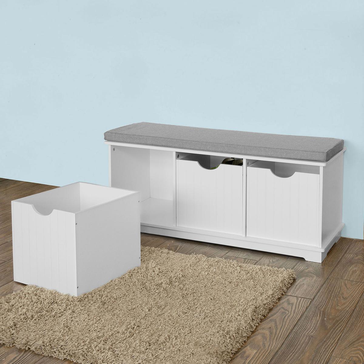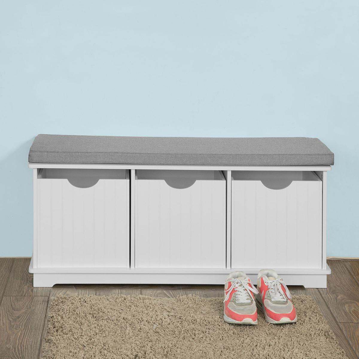 Modern design 3 drawers bench with soft seat cushion, good choice for hallway and living room. The padded seat which is removable is ideal for comfortable sitting while putting on and taking off shoes. 3 drawers provide ample storage space for shoes, boxes, books, magazines, etc. In addition, they can be pulled out completely as a great storage solution.