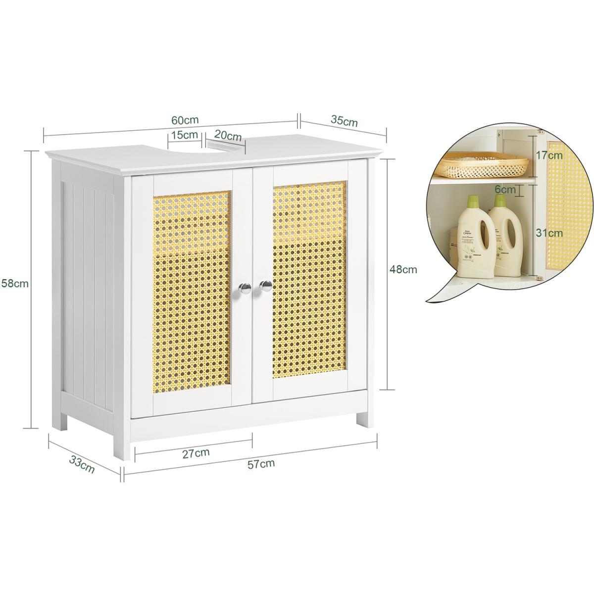 It has a cupboard with internal adjustable shelf to ensure ample storage for all your bathroom essentials. 'U' shaped cut-out slots in easily underneath your sink (please measure before purchasing).The lattice design allows air to flow in and out, as well as preventing steam and mildew build-up inside. Space saving storage solution that will help keep your bathroom tidy and organized.
