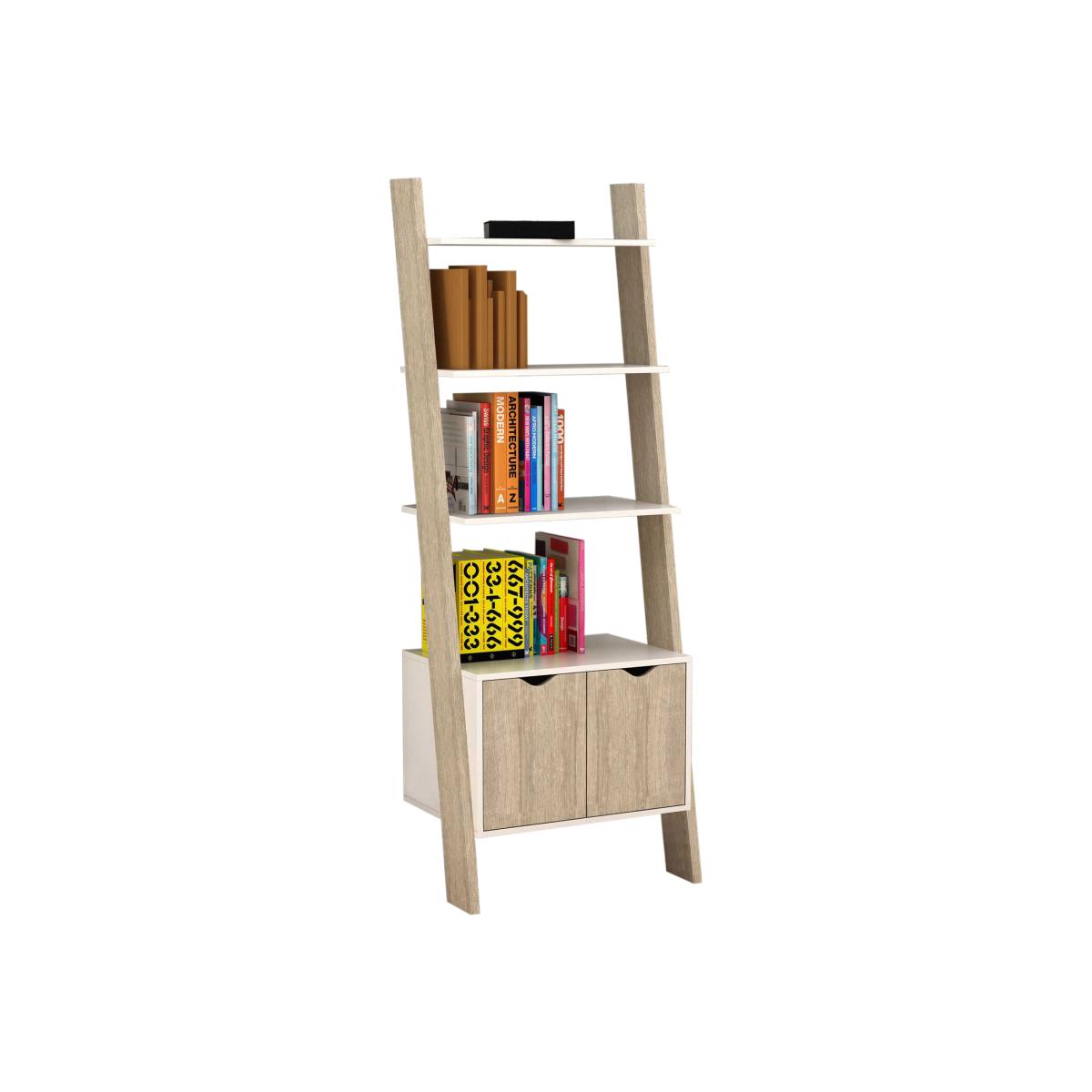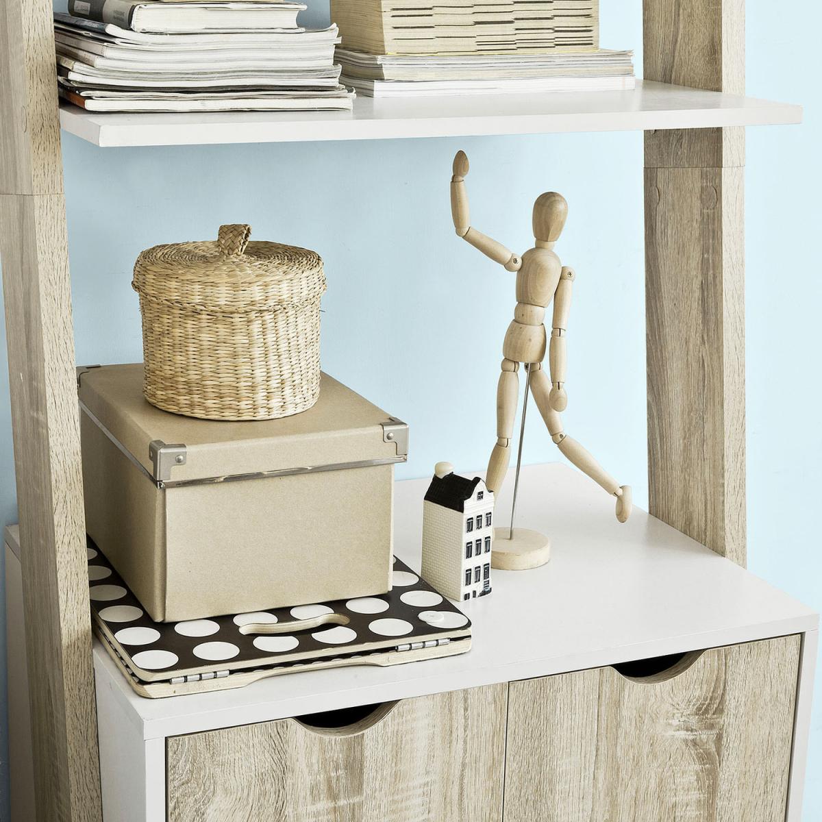 Simply elegant design storage display ladder shelf with 3 shelves and 1 cabinet. A ladder design for a stable furthermore eye-catching look. 3 shelves for storing and display anything you might need in reach. High-quality material and stable frame make the shelves suitable for a variety of locations, like the living room, children room and office. You can fix it to the wall (wall brackets provided) or just lean it. The decorative elements are not included in the delivery.