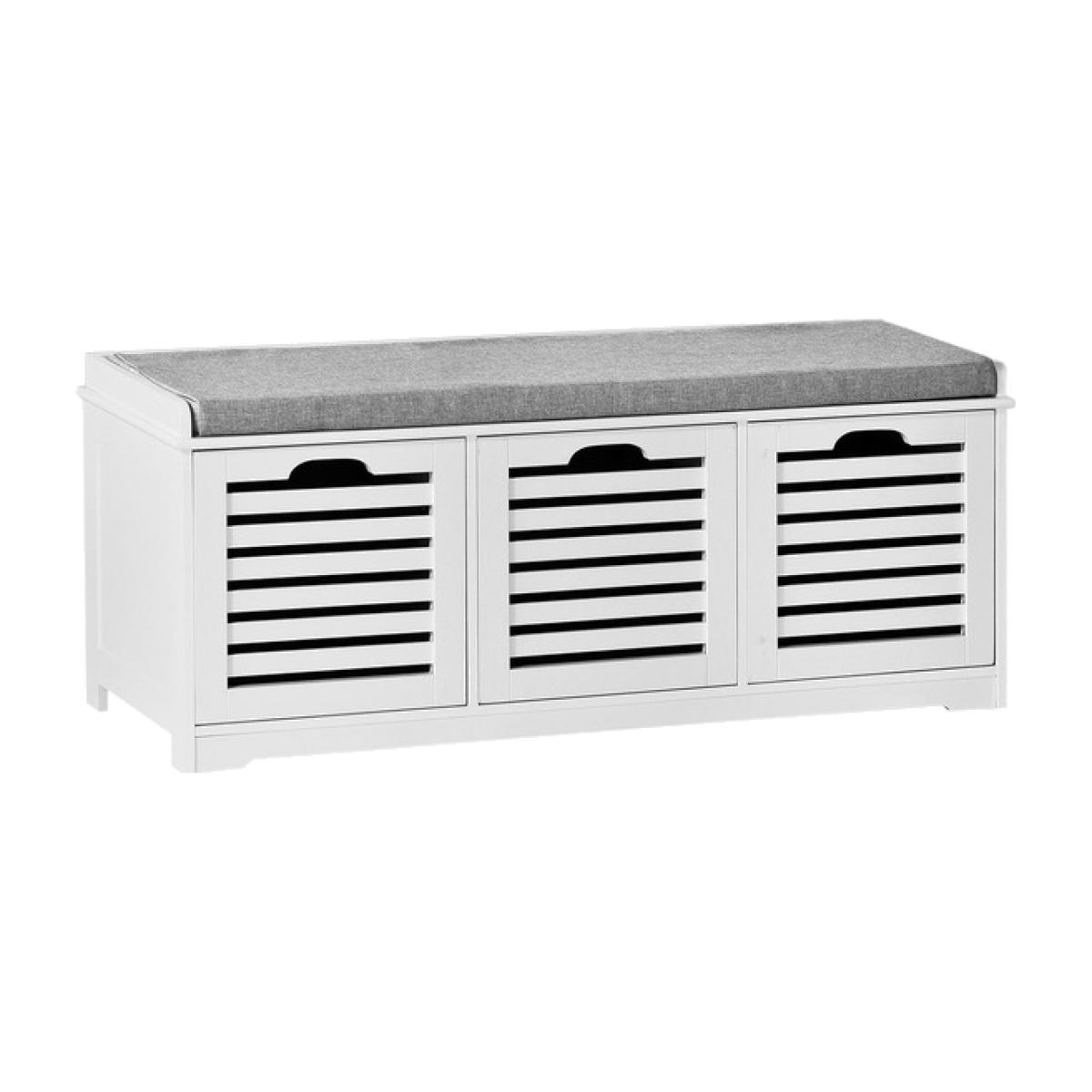 Modern design 3 drawers bench with soft seat cushion, good choice for hallway and living room. The padded seat which is removable is ideal for comfortable sitting while putting on and taking off shoes. 3 drawers provide ample storage space for shoes, boxes, books, magazines, etc. In addition, they can be pulled out completely as a great storage solution.