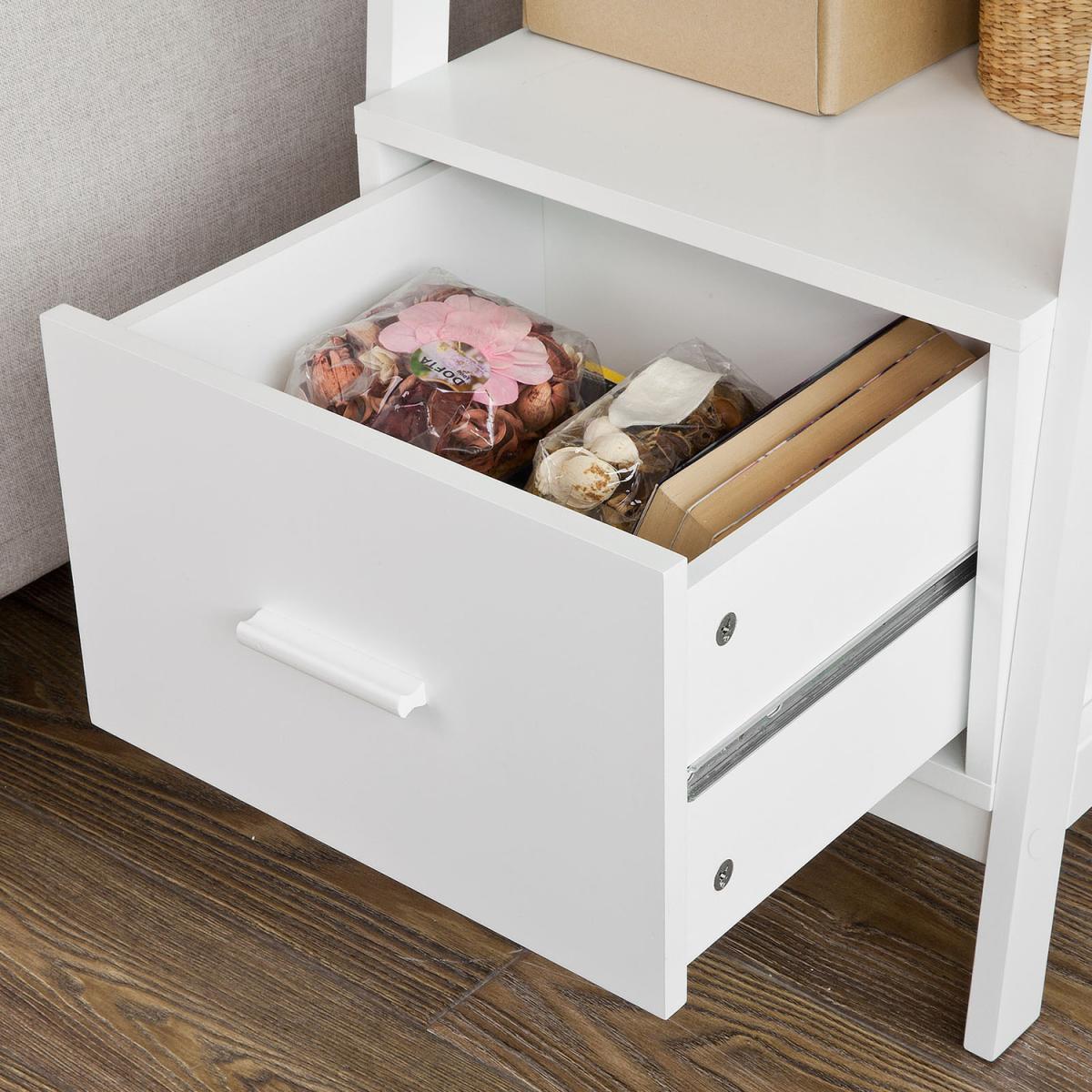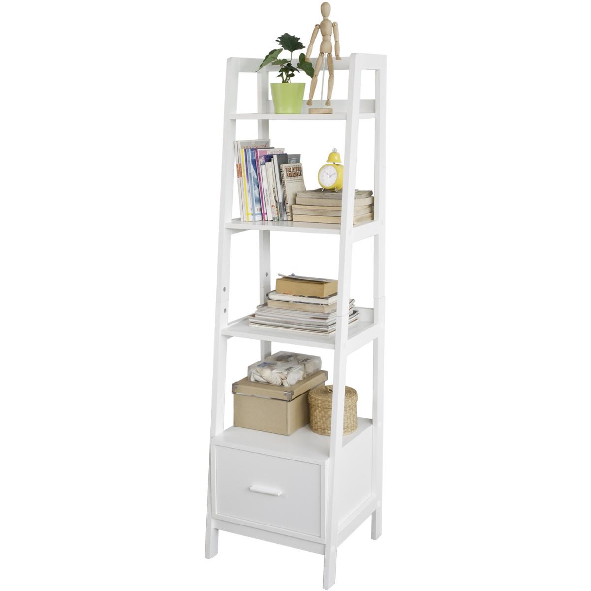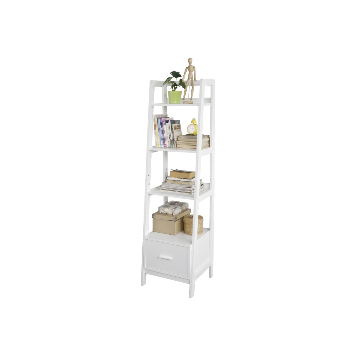 Simply elegant design storage display ladder shelf with 1 drawer and 4 shelves. High-quality material and stable frame make the shelves suitable for a variety of locations, like the living room, children room and office. A ladder design for a stable furthermore eye-catching look. Four shelves for storing and display anything you might need in reach. Large drawer area so you can have more than enough space for your books or other items. High-density fiberboard (MDF) with a white finish.