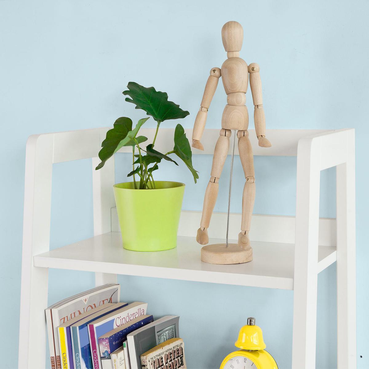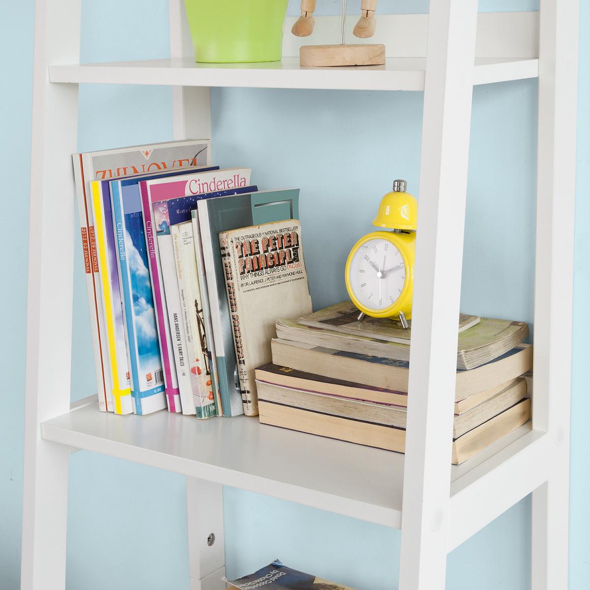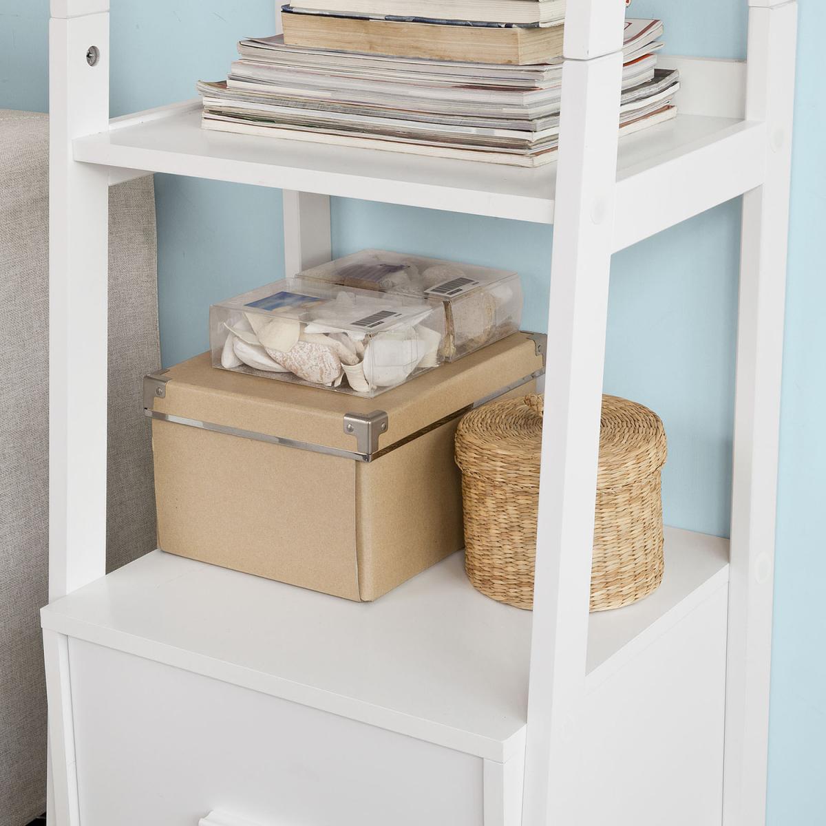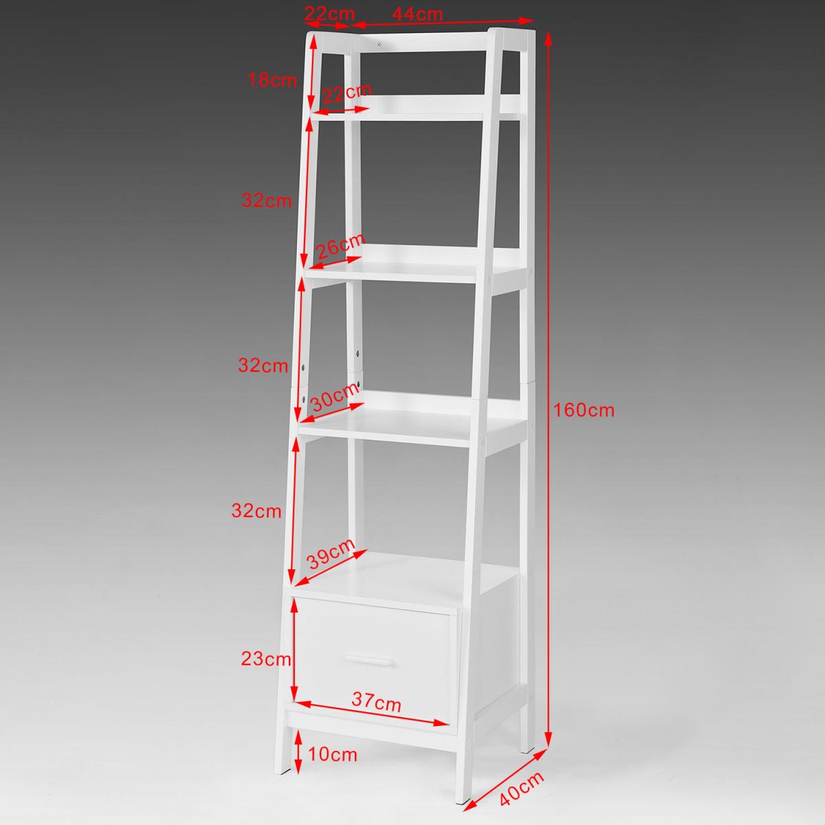 Simply elegant design storage display ladder shelf with 1 drawer and 4 shelves. High-quality material and stable frame make the shelves suitable for a variety of locations, like the living room, children room and office. A ladder design for a stable furthermore eye-catching look. Four shelves for storing and display anything you might need in reach. Large drawer area so you can have more than enough space for your books or other items. High-density fiberboard (MDF) with a white finish.