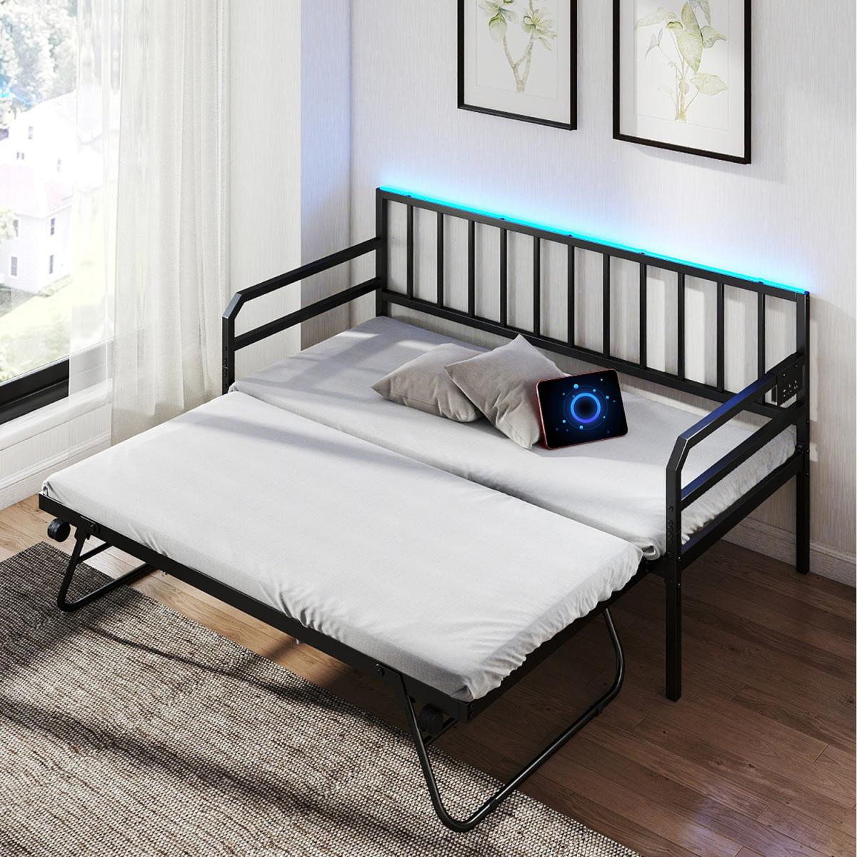 Enhance your living area with this single size metal daybed! Thanks to integrated LED lights, the sofa bed creates a warm and inviting atmosphere. Equipped with a built-in charging station, it conveniently keeps your devices powered and within reach. Additionally, this versatile daybed doubles as comfortable seating by day and transforms into a cozy sleeping area at night with its trundle. Constructed from a sturdy metal frame, the sofa bed frame ensures long-lasting durability and prevents sagging. Perfectly combining functionality with style, this daybed adapts seamlessly to your various needs.