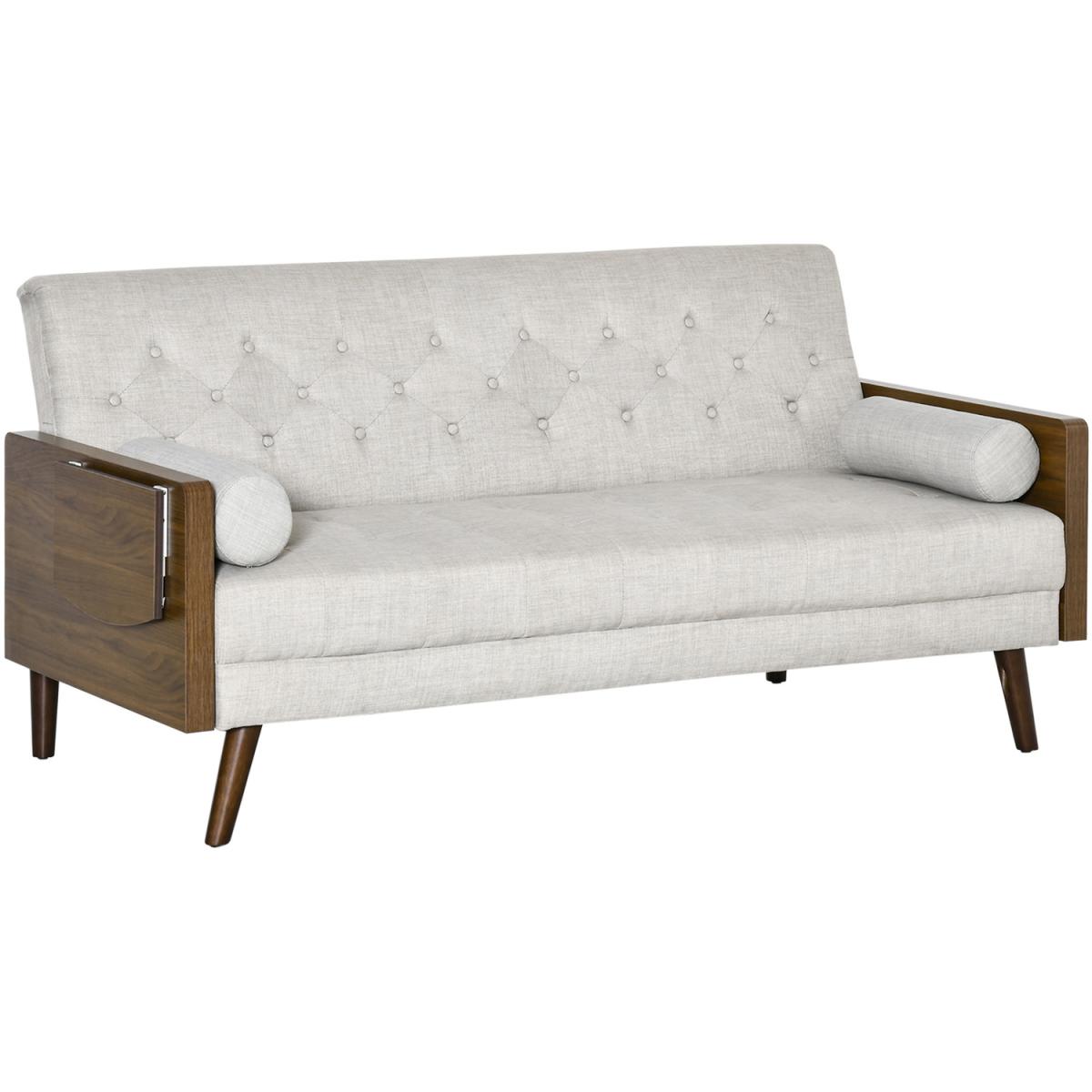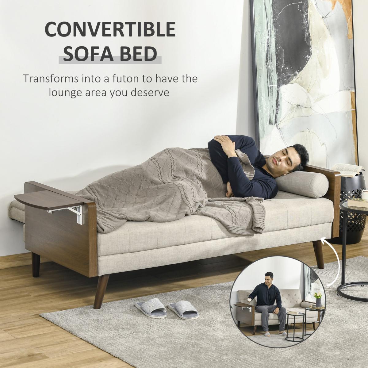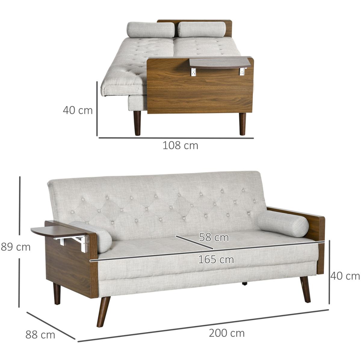 This three-seater HOMCOM sofa bed gives you space you deserve to relax and rest, day and night. It comes in a retro design, for something different in your living space. The three-position backrest allows you to lie back to a position of your choice - the click-clack mechanism makes it easy to adjust. Both the seat and backrest are thickly padded, with two long pillows included for extra comfort. Complete with lift-up side tables.