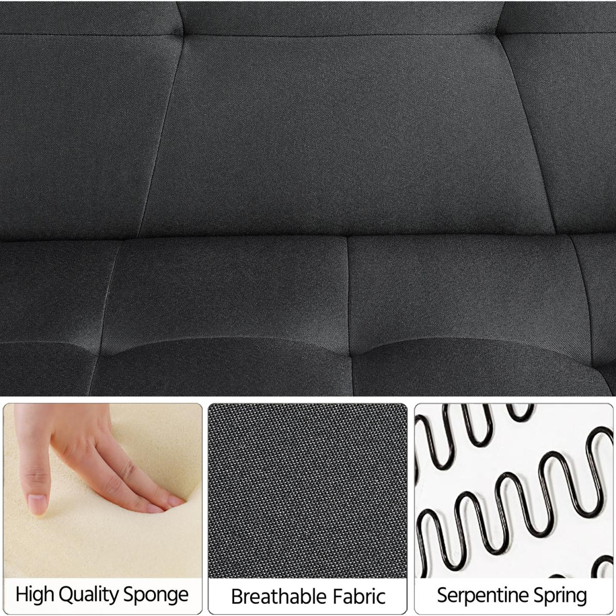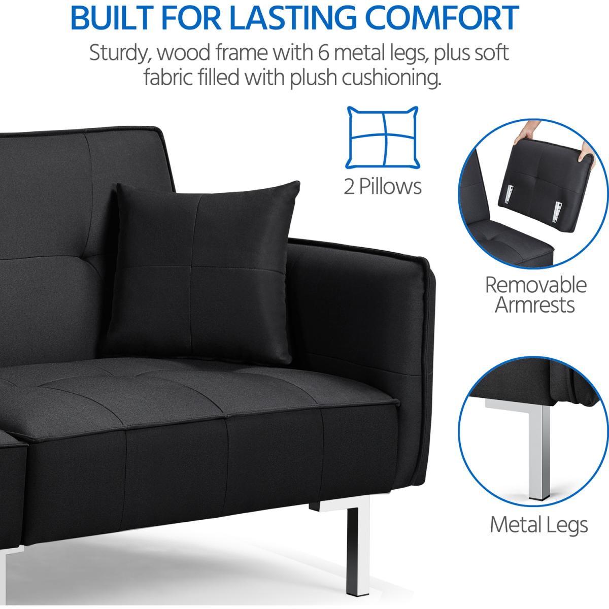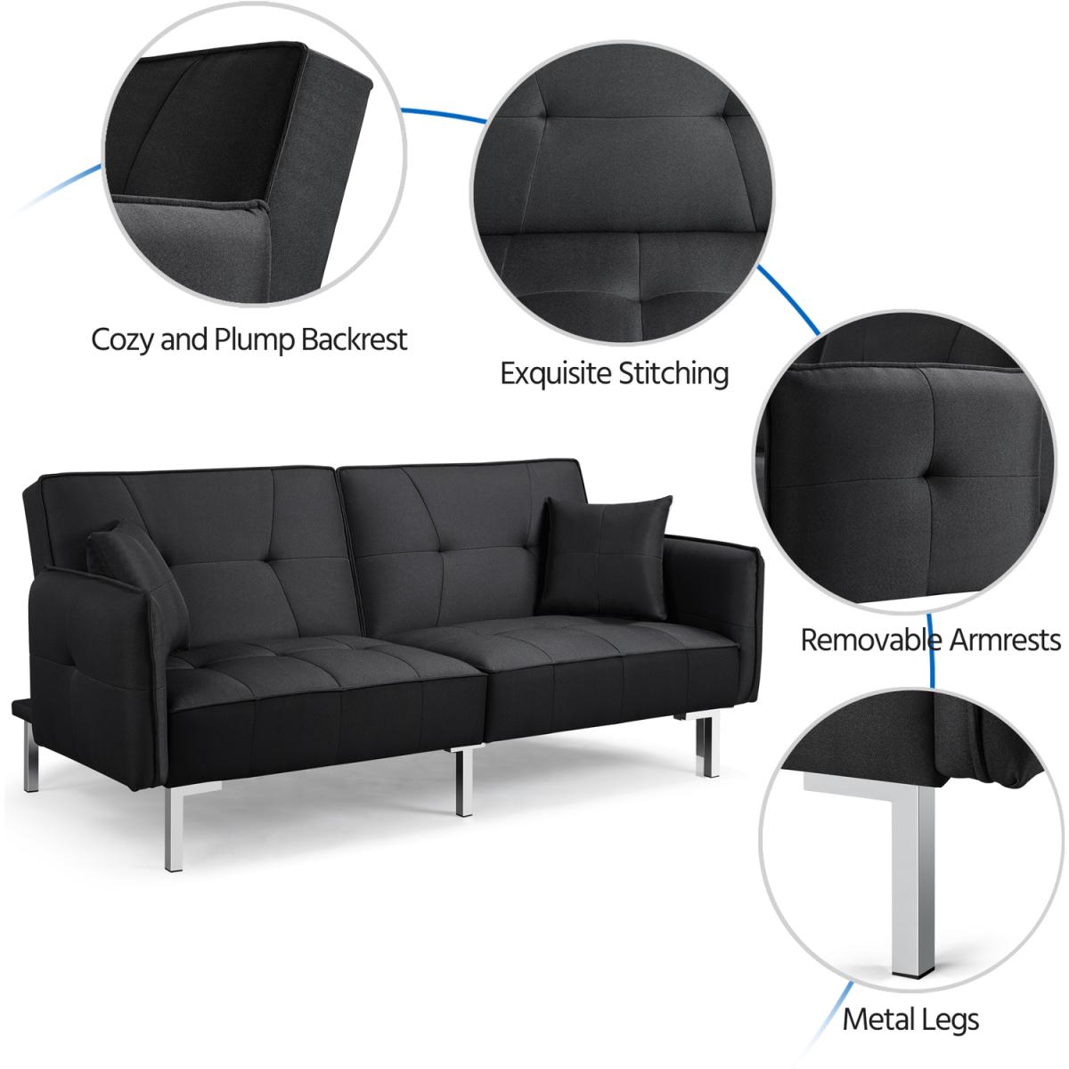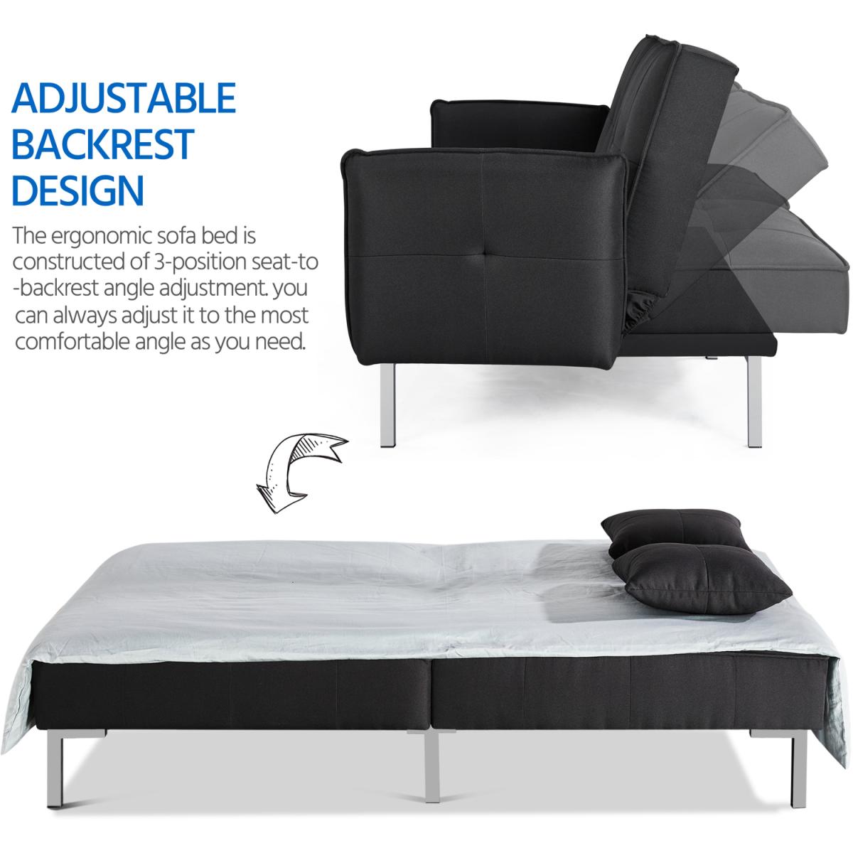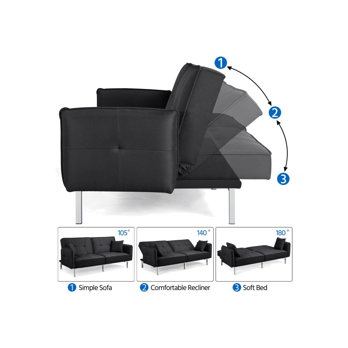 This convertible fabric sofa bed futon offers an all-in-one sofa solution for your small spaces. It is built of a durable hardwoodplywood frame and metal legs to last for years. An ergonomically adjustable backrest adds to your reclining comfort. Take full advantage of 3 leaninglying positions at 105, 140 or 180 degrees, and you'll enjoy the sofa comfort at different levels.