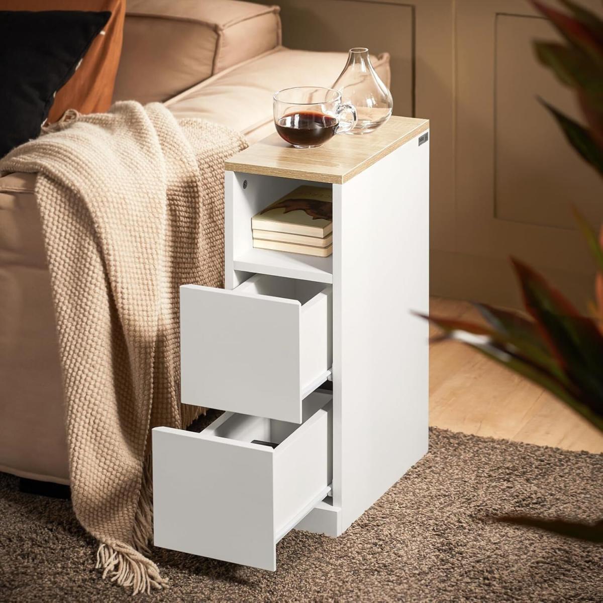 I’m a fan of this little white side table because it squeezes plenty of storage into a slim profile - perfect beside a sofa or under a bedside lamp in a compact flat. The clean lines and neutral finish suit Scandi-inspired, modern-minimalist or coastal schemes, while the light oak top softens the look and brings a hint of warmth. For styling, use the open cubby for your current reads or a small plant, then stow remotes, chargers or toiletries in the drawers to keep surfaces clutter-free. Top it with a carafe and glass for evening drinks or a simple lamp to create a cosy reading nook without taking up much floor space.