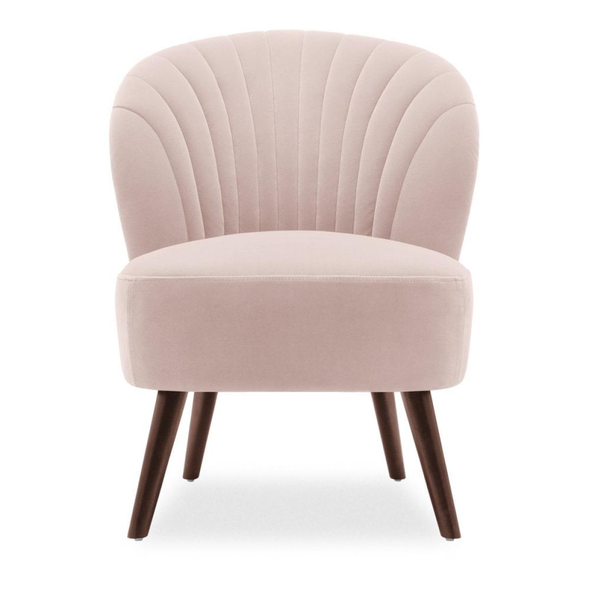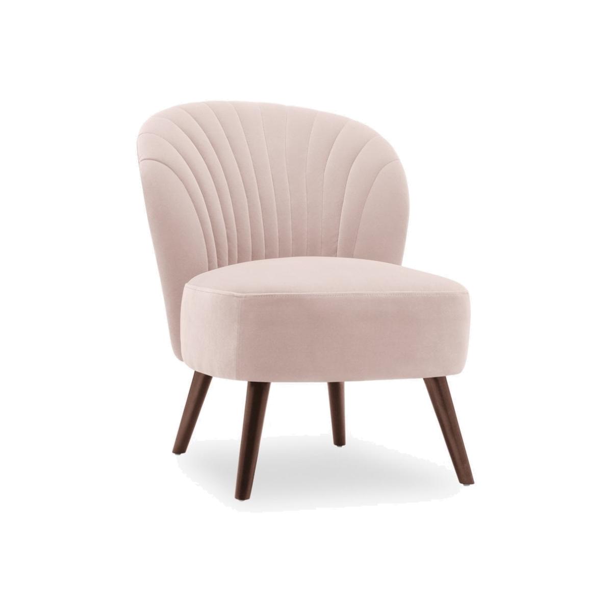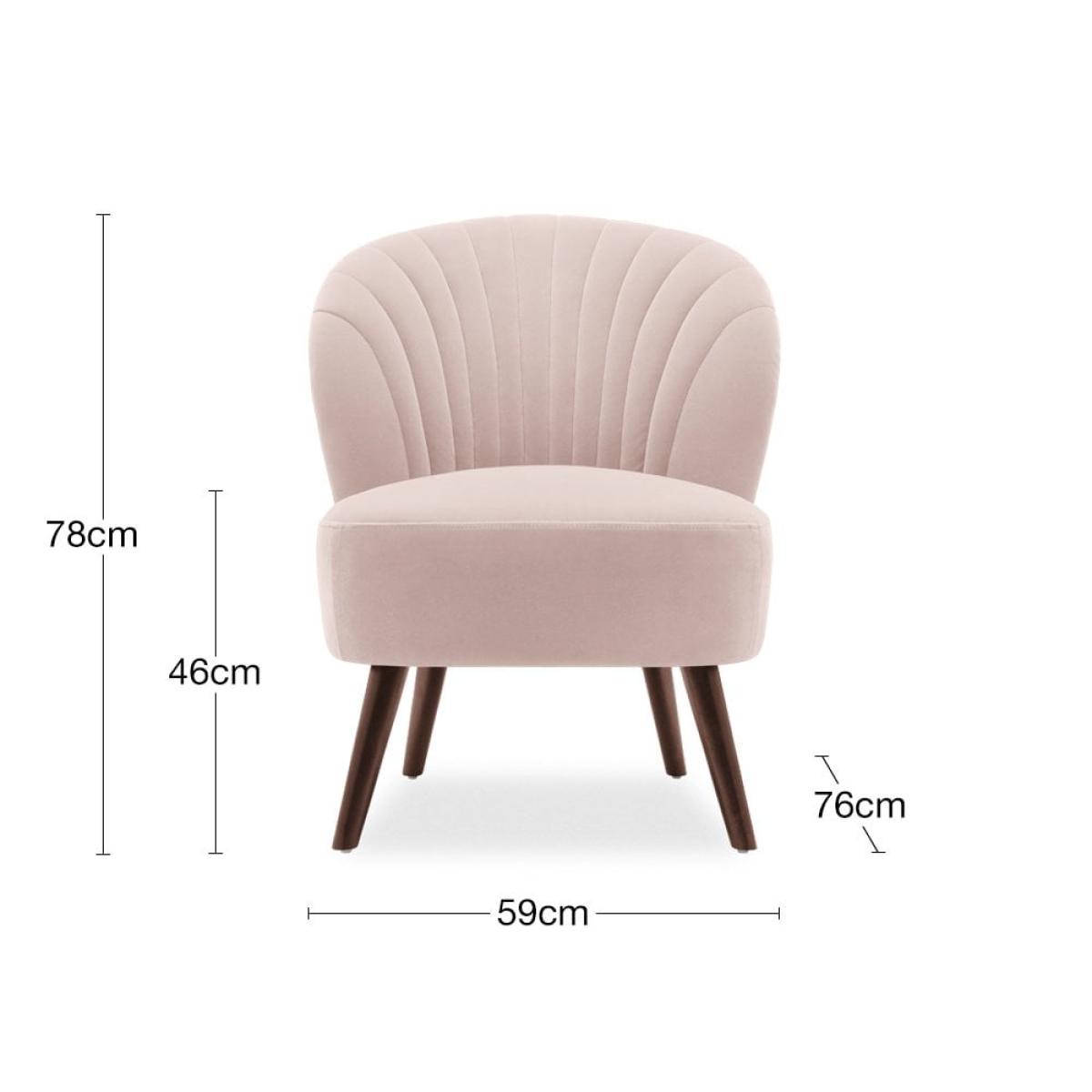 Sit back and relax into the Sofia accent chair. This curved armchair has an elegant back with fan stitched design - giving it a distinct art deco feel to your home. The comfortably padded seat is upholstered in plush light pink velvet material, contrasted with walnut wooden legs. Place in your living room or bedroom nook for an injection of style meets comfort.