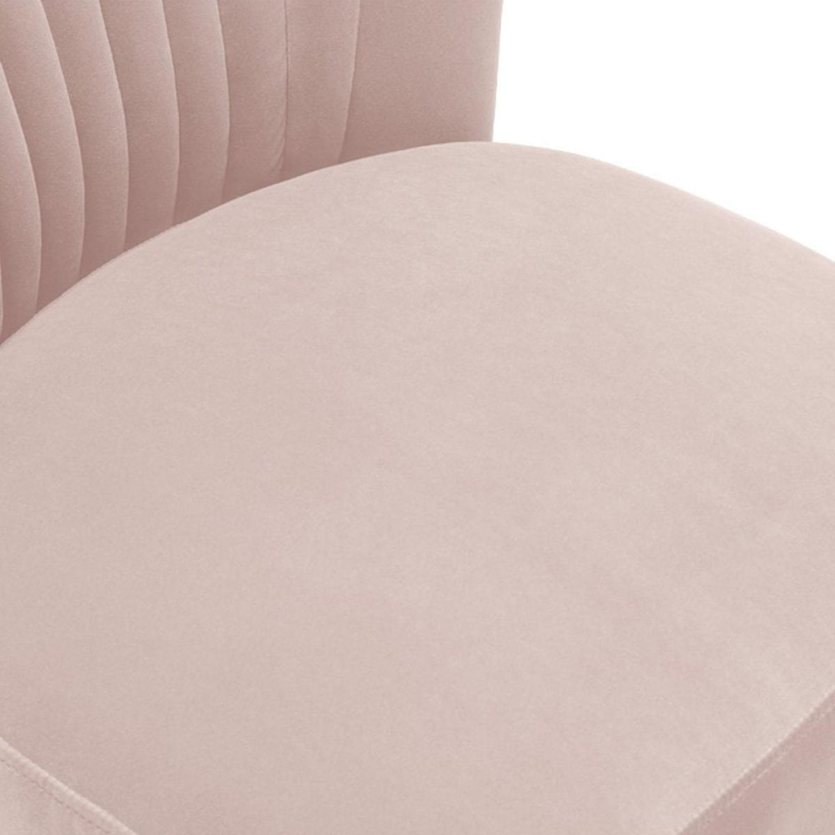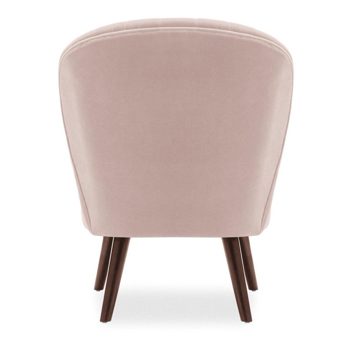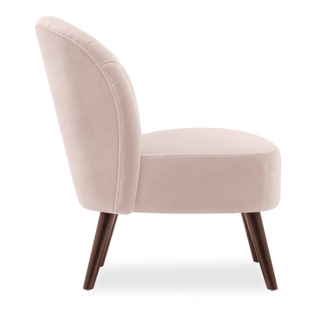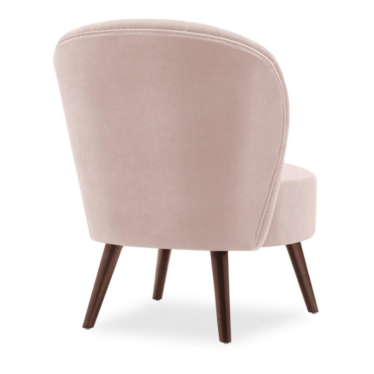 Sit back and relax into the Sofia accent chair. This curved armchair has an elegant back with fan stitched design - giving it a distinct art deco feel to your home. The comfortably padded seat is upholstered in plush light pink velvet material, contrasted with walnut wooden legs. Place in your living room or bedroom nook for an injection of style meets comfort.