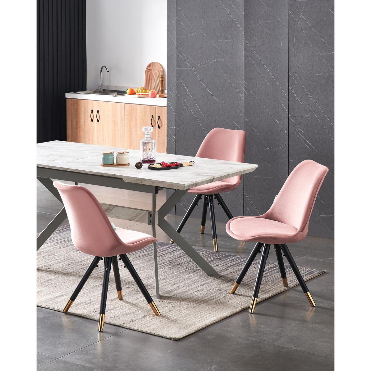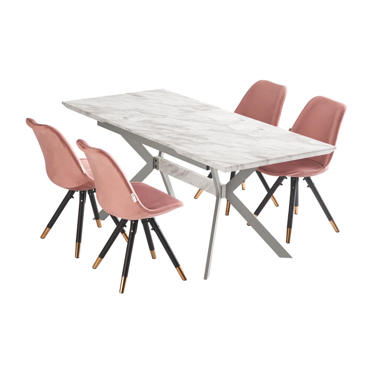 We are introducing the Sofia Blaze dining set of 4 that includes a Blaze Rectangle Dining Table, features an evergreen aesthetic and functionality of iconic mid-century modern furniture. Simply pull the table ends apart and an extra leaf pops into place allowing you to seat six with ease. The base is the sculptural cross-shaped design of legs in powder-coated MDF. The chic and innovative table to pass the test of time and help you live better. Comes with the Scandinavian and iconic Sofia faux leather cushioned Dining chairs, Curated with utmost care and precision to detail. The Chair features high-density foam cushioning with metal legs covered with gold end caps. The union between ergonomic construction and padded seating ensures comfort levels are premium. The style and comfort levels are simply unmatched. Modern design with simple lines complemented with delicate curves and upholstered in soft lush velvet. The dining set is ideal for the dining room, kitchen restaurant, and many more.
