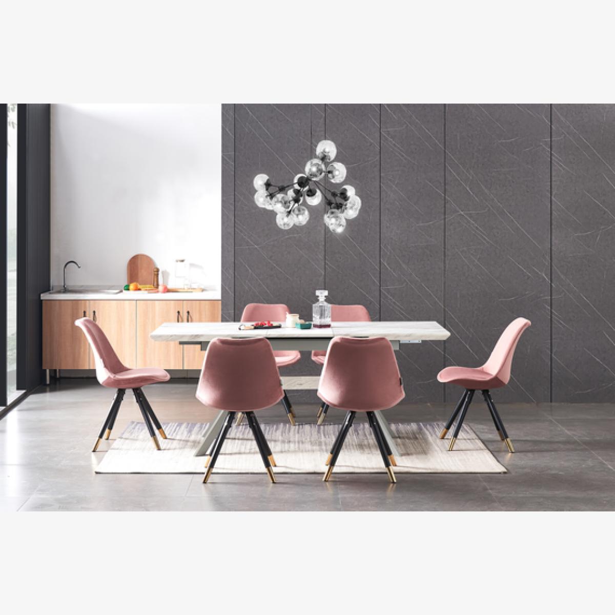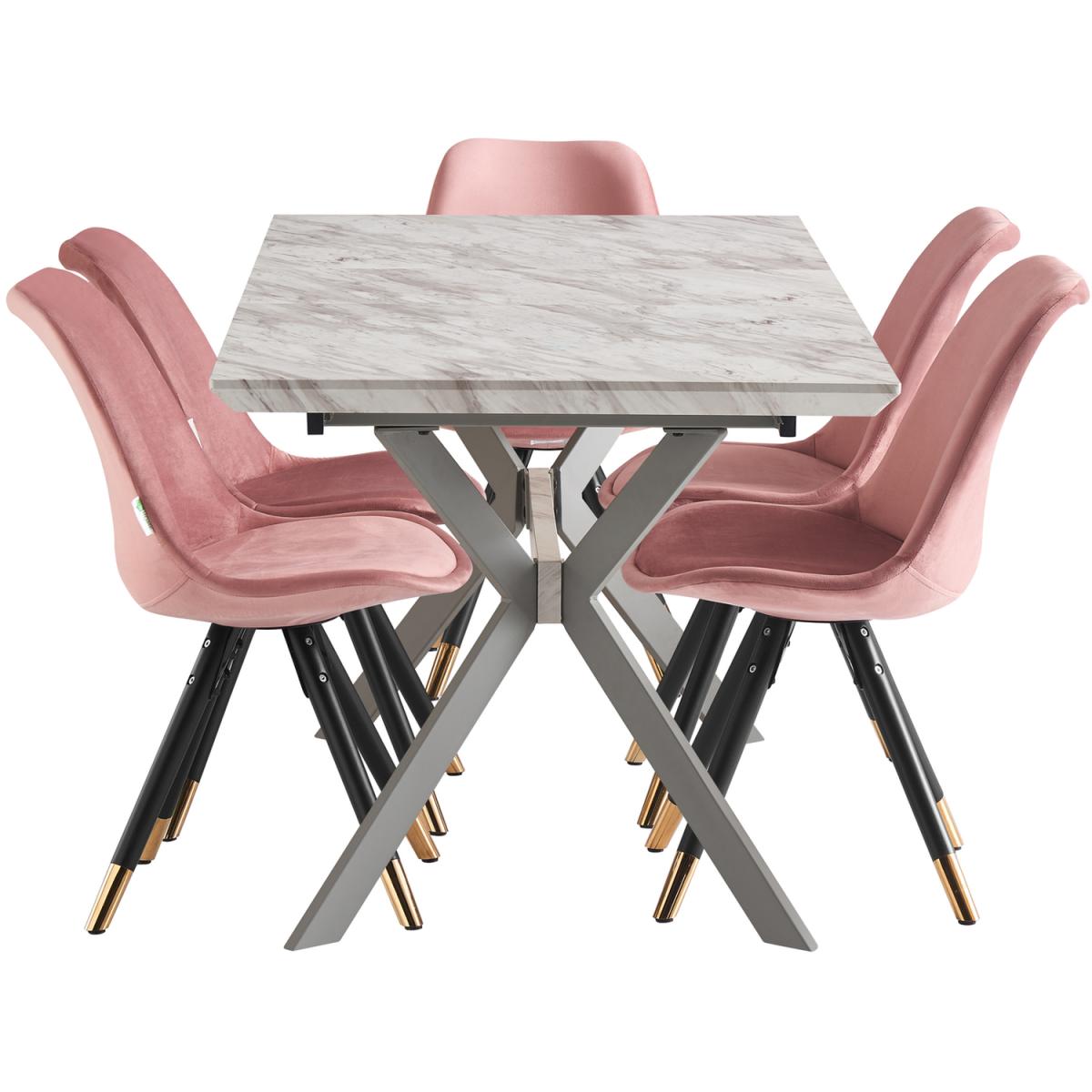 We are introducing the Sofia Blaze dining set of 6 that includes a Blaze Rectangle Dining Table, features an evergreen aesthetic and functionality of iconic mid-century modern furniture. Simply pull the table ends apart and an extra leaf pops into place allowing you to seat six with ease. The base is the sculptural cross-shaped design of legs in powder-coated MDF. The chic and innovative table to pass the test of time and help you live better. Comes with the Scandinavian and iconic Sofia faux leather cushioned Dining chairs, Curated with utmost care and precision to detail. The Chair features high-density foam cushioning with metal legs covered with gold end caps. The union between ergonomic construction and padded seating ensures comfort levels are premium. The style and comfort levels are simply unmatched. Modern design with simple lines complemented with delicate curves and upholstered in soft lush velvet. The dining set is ideal for the dining room, kitchen restaurant, and many more.