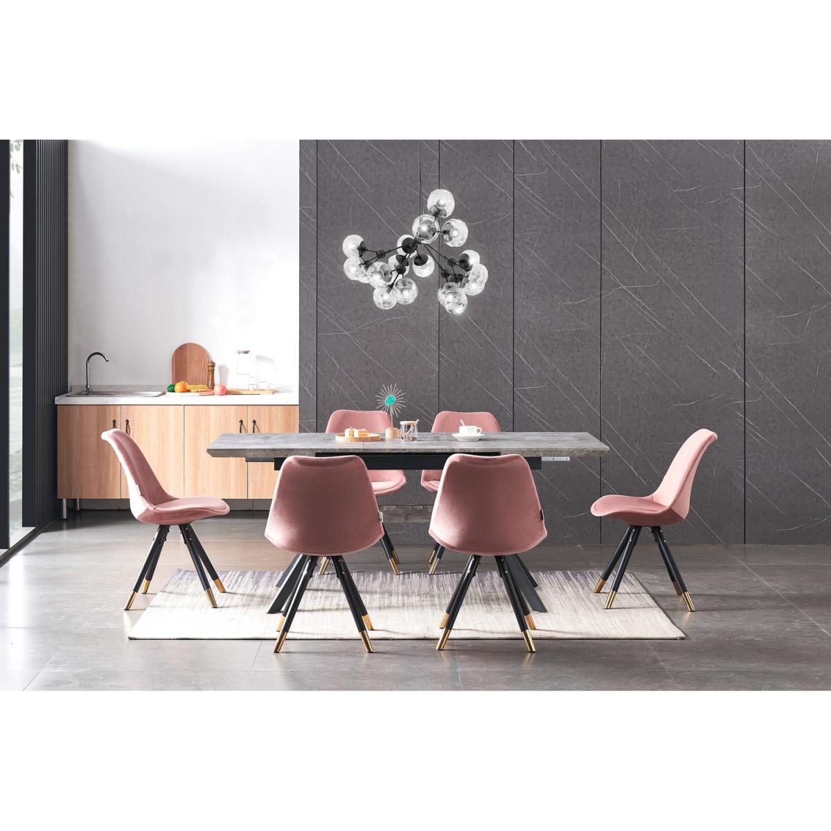 We are introducing the Sofia Blaze dining set of 6 that includes a Blaze Rectangle Dining Table, features an evergreen aesthetic and functionality of iconic mid-century modern furniture. Simply pull the table ends apart and an extra leaf pops into place allowing you to seat six with ease. The base is the sculptural cross-shaped design of legs in powder-coated MDF. The chic and innovative table to pass the test of time and help you live better. Comes with the Scandinavian and iconic Sofia faux leather cushioned Dining chairs, Curated with utmost care and precision to detail. The Chair features high-density foam cushioning with metal legs covered with gold end caps. The union between ergonomic construction and padded seating ensures comfort levels are premium. The style and comfort levels are simply unmatched. Modern design with simple lines complemented with delicate curves and upholstered in soft lush velvet. The dining set is ideal for the dining room, kitchen restaurant, and many more.