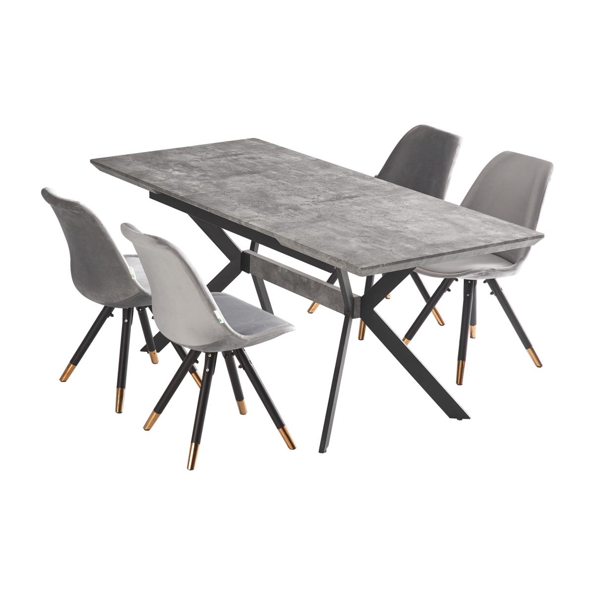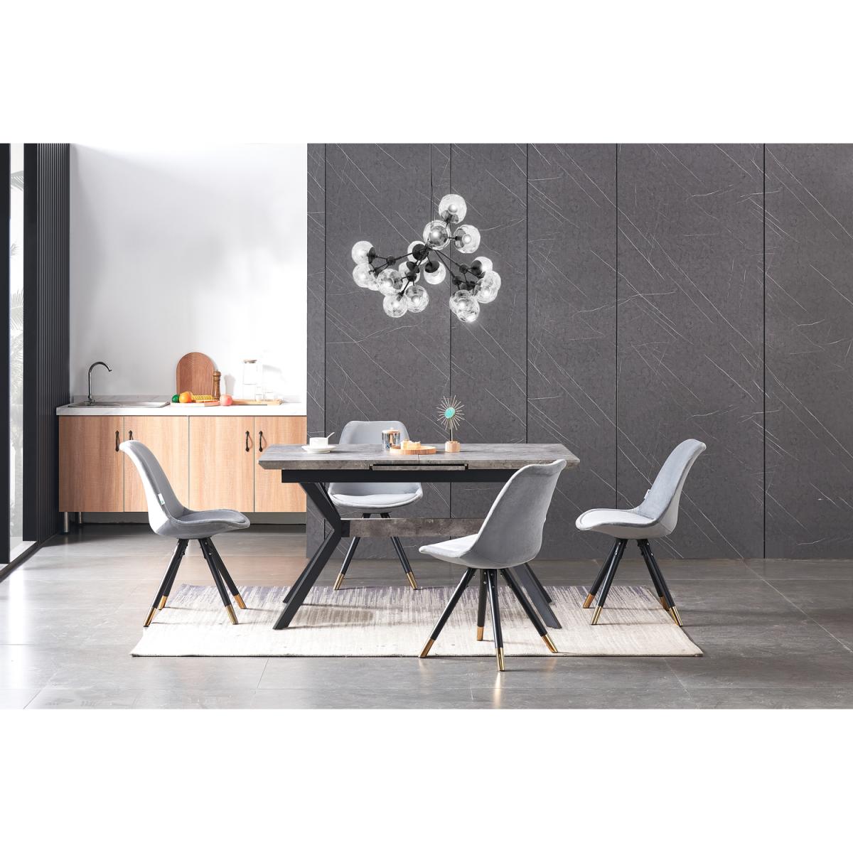 We are introducing the Sofia Blaze dining set of 4 that includes a Blaze Rectangle Dining Table, features an evergreen aesthetic and functionality of iconic mid-century modern furniture. Simply pull the table ends apart and an extra leaf pops into place allowing you to seat six with ease. The base is the sculptural cross-shaped design of legs in powder-coated MDF. The chic and innovative table to pass the test of time and help you live better. Comes with the Scandinavian and iconic Sofia faux leather cushioned Dining chairs, Curated with utmost care and precision to detail. The Chair features high-density foam cushioning with metal legs covered with gold end caps. The union between ergonomic construction and padded seating ensures comfort levels are premium. The style and comfort levels are simply unmatched. Modern design with simple lines complemented with delicate curves and upholstered in soft lush velvet. The dining set is ideal for the dining room, kitchen restaurant, and many more.