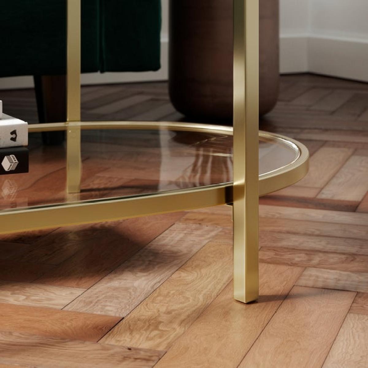 * Glass Table * Metal Legs * Easy to assemble This dual-tiered coffee table offers abundant space for coffee, desserts, laptops, books, and storage baskets, enhancing functionality in any room. Its oval shape and size also make it perfect for use as a TV table or for home entertainment. Crafted from premium tempered glass, the tabletops boast exceptional strength and heat resistance, ensuring stability and safety.
