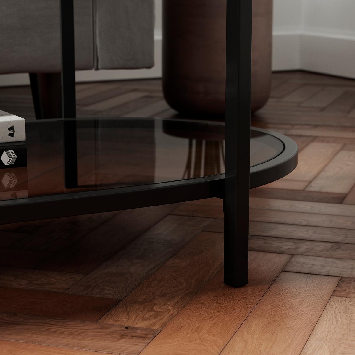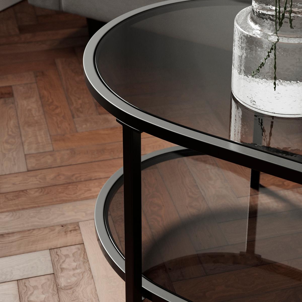 * Glass Table* Metal Legs* Easy to assemble This dual-tiered coffee table offers abundant space for coffee, desserts, laptops, books, and storage baskets, enhancing functionality in any room. Its oval shape and size also make it perfect for use as a TV table or for home entertainment. Crafted from premium tempered glass, the tabletops boast exceptional strength and heat resistance, ensuring stability and safety.