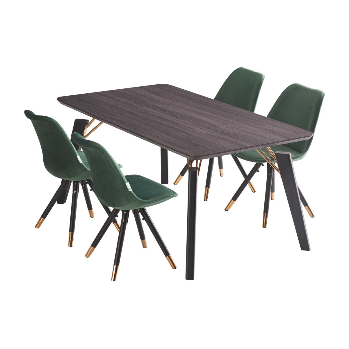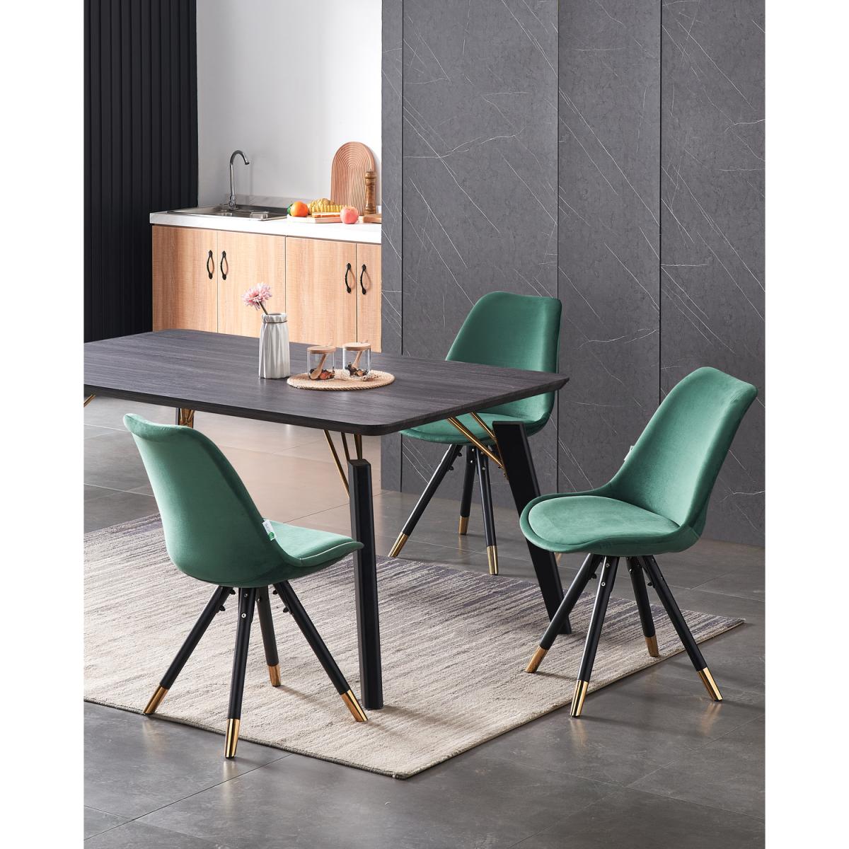 The Cosmo LUX Rectangle Dining Table has been designed with precision and a luxury finish to deliver an amazing dining experience. The sleek design of this table is giving it both functionality and a modern look with a touch of a rustic home feel. The wooden look of the top gives it a warm rustic feel while the black metal legs with a gold chrome frame bring the modern feel. Its luxury yet simple design will elevate your dining space to a new level. Comes with the Scandinavian and iconic Sofia faux leather cushioned Dining chairs, Curated with utmost care and precision to detail. The Chair features high-density foam cushioning with metal legs covered with gold end caps. The union between ergonomic construction and padded seating ensures comfort levels are premium. The style and comfort levels are simply unmatched. Modern design with simple lines complemented with delicate curves and upholstered in soft lush velvet. The dining set is ideal for the dining room, kitchen restaurant, and many more.