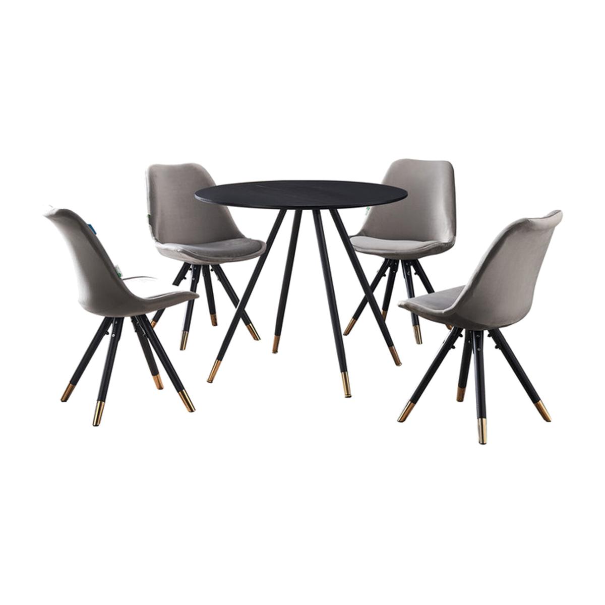 Bring a flexible gaze to your eye-catching kitchen with this space-saving Sofia Dorchester Versatile LUX Dining Set. The set comes with a Dorchester Lux Dining Table featuring a premium quality tabletop that has been crafted from MDF and 3D paper. A table is supported by exquisite black powder-coated metal legs with gold-tipped feet for that added oomph. The table legs are non-slip, anti-rust, waterproof, and stable accompanied by non-slip foot pads protecting your floor and carpet. Also, the Retro chairs feature a curved back and velvet padded seat, supported by four metal legs that provide enduring strength and sturdiness. Moreover, the legs also have gold round adjustable feet that improve their stability and add great value to your interior. Our ergonomic chair offers an exceptionally comfortable sitting experience. Since the dining chair cushion is soft and stylish, the curved back is the definition of elegance, providing your low back or spine with enough support for a long-term relaxation. Perfect for the office, dining room, living room, kitchen, hotel, caf, or restaurant.
