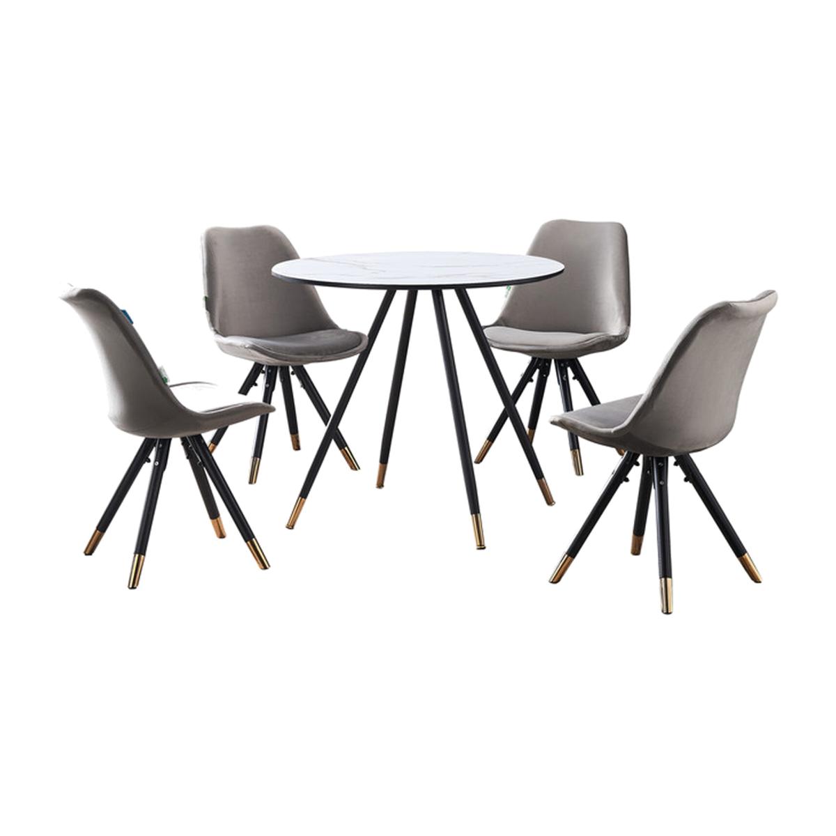 Bring a flexible gaze to your eye-catching kitchen with this space-saving Sofia Dorchester Versatile LUX Dining Set. The set comes with a Dorchester Lux Dining Table featuring a premium quality table top that has been crafted from MDF and 3D paper. A table is supported by exquisite black powder-coated metal legs with gold-tipped feet for that added oomph. The table legs are non-slip, anti-rust, waterproof, and stable accompanied by non-slip foot pads protecting your floor and carpet. Also, the Retro chairs feature a curved back and velvet padded seat, supported by four metal legs that provide enduring strength and sturdiness. Moreover, the legs also have gold round adjustable feet that improve their stability and add great value to your interior. Our ergonomic chair offers an exceptionally comfortable sitting experience. Since the dining chair cushion is soft and stylish, the curved back is the definition of elegance, providing your low back or spine enough support for a long-term relaxation. Perfect for the office, dining room, living room, kitchen, hotel, caf, or restaurant.