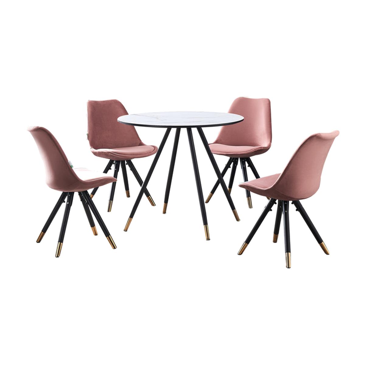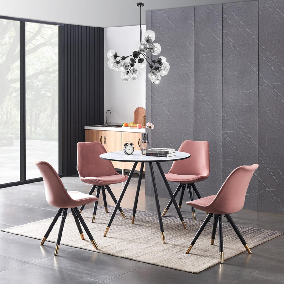 Bring a flexible gaze to your eye-catching kitchen with this space-saving Sofia Dorchester Versatile LUX Dining Set. The set comes with a Dorchester Lux Dining Table featuring a premium quality table top that has been crafted from MDF and 3D paper. A table is supported by exquisite black powder-coated metal legs with gold-tipped feet for that added oomph. The table legs are non-slip, anti-rust, waterproof, and stable accompanied by non-slip foot pads protecting your floor and carpet. Also, the Retro chairs feature a curved back and velvet padded seat, supported by four metal legs that provide enduring strength and sturdiness. Moreover, the legs also have gold round adjustable feet that improve their stability and add great value to your interior. Our ergonomic chair offers an exceptionally comfortable sitting experience. Since the dining chair cushion is soft and stylish, the curved back is the definition of elegance, providing your low back or spine enough support for a long-term relaxation. Perfect for the office, dining room, living room, kitchen, hotel, caf, or restaurant.