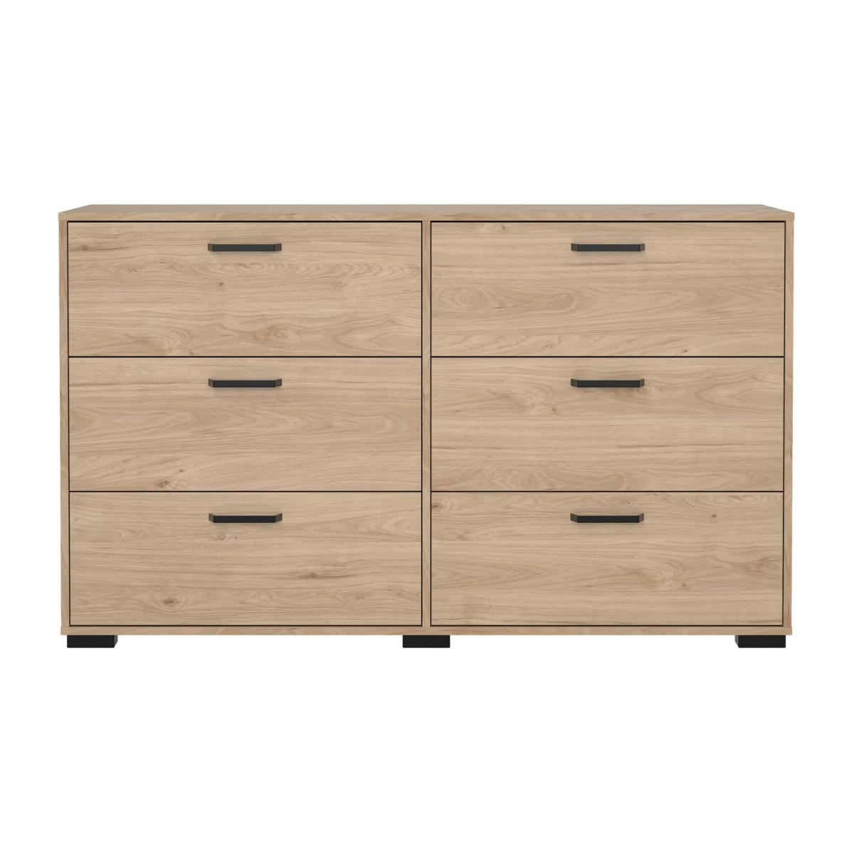 I love this dresser because of its versatile Jackson Hickory Oak finish, which works well in both contemporary and Scandinavian-inspired interiors. Its clean lines and natural wood tone add warmth and texture, making it a practical yet stylish choice for bedrooms or even living spaces with minimal or modern decor. For styling tips, consider pairing it with textured textiles and monochrome accessories to highlight its natural wood grain. Additionally, its spacious drawers make it highly functional, perfect for organising clothing, linens, or miscellaneous items, while keeping your space looking tidy and cohesive.
