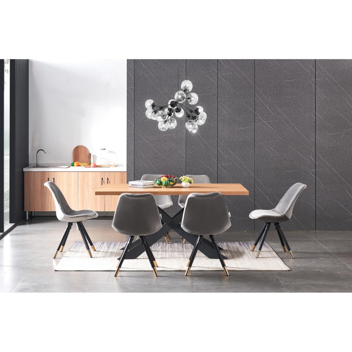 We are offering the dining set of 6 that includes the Duke table featuring a quality finish with a stylish aesthetic and is sure to start a conversation. The Metal powder coated legs are sturdy and built to stand the test of time and with their X-form design make a striking statement. The duke table comes with the Scandinavian and iconic Sofia faux leather cushioned Dining chairs, Curated with utmost care and precision to detail. The Chair features high-density foam cushioning with metal legs covered with gold end caps. The union between ergonomic construction and padded seating ensures comfort levels are premium. The style and comfort levels are simply unmatched. Modern design with simple lines complemented with delicate curves and upholstered in soft lush velvet. The dining set is ideal for the dining room, kitchen restaurant, and many more.
