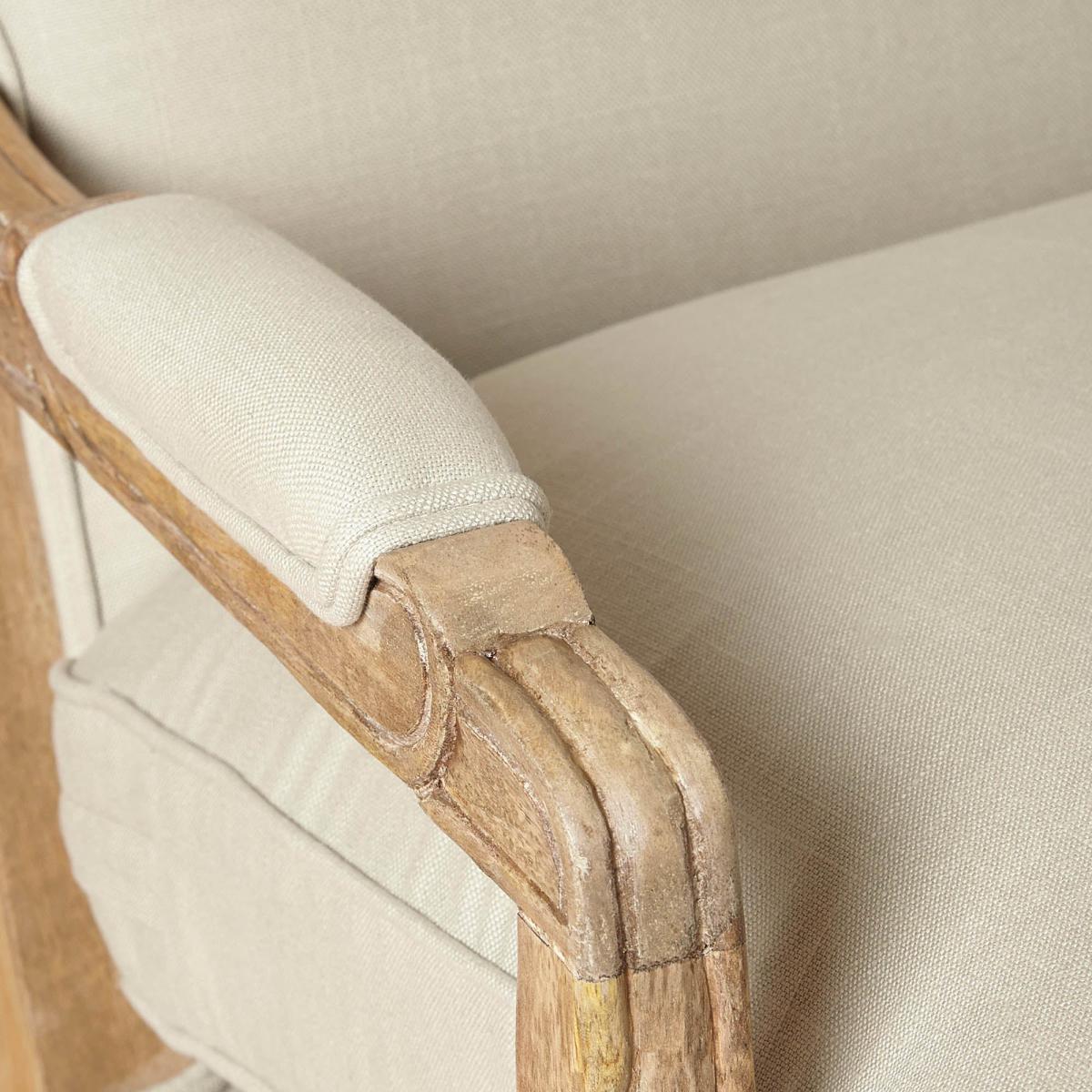 I love the classic elegance of this sofa, making it a versatile piece that works well in both traditional and contemporary interiors. The natural linen fabric adds a relaxed, airy feel, while the carved wooden frame lends a touch of sophistication. For styling, consider pairing it with neutral and warm tones to highlight its natural look, or add colourful cushions for personality. It's especially well-suited to living rooms, reading nooks, or even a cosy corner in a bedroom. Practical tips include balancing it with a textured rug underneath and using simple, understated decor to let the chair shine as a focal point.