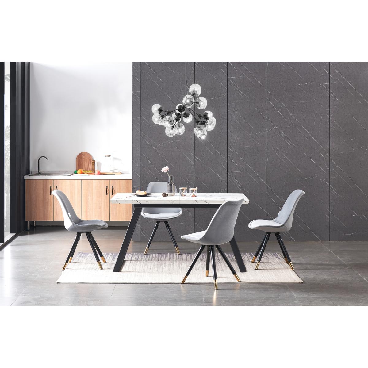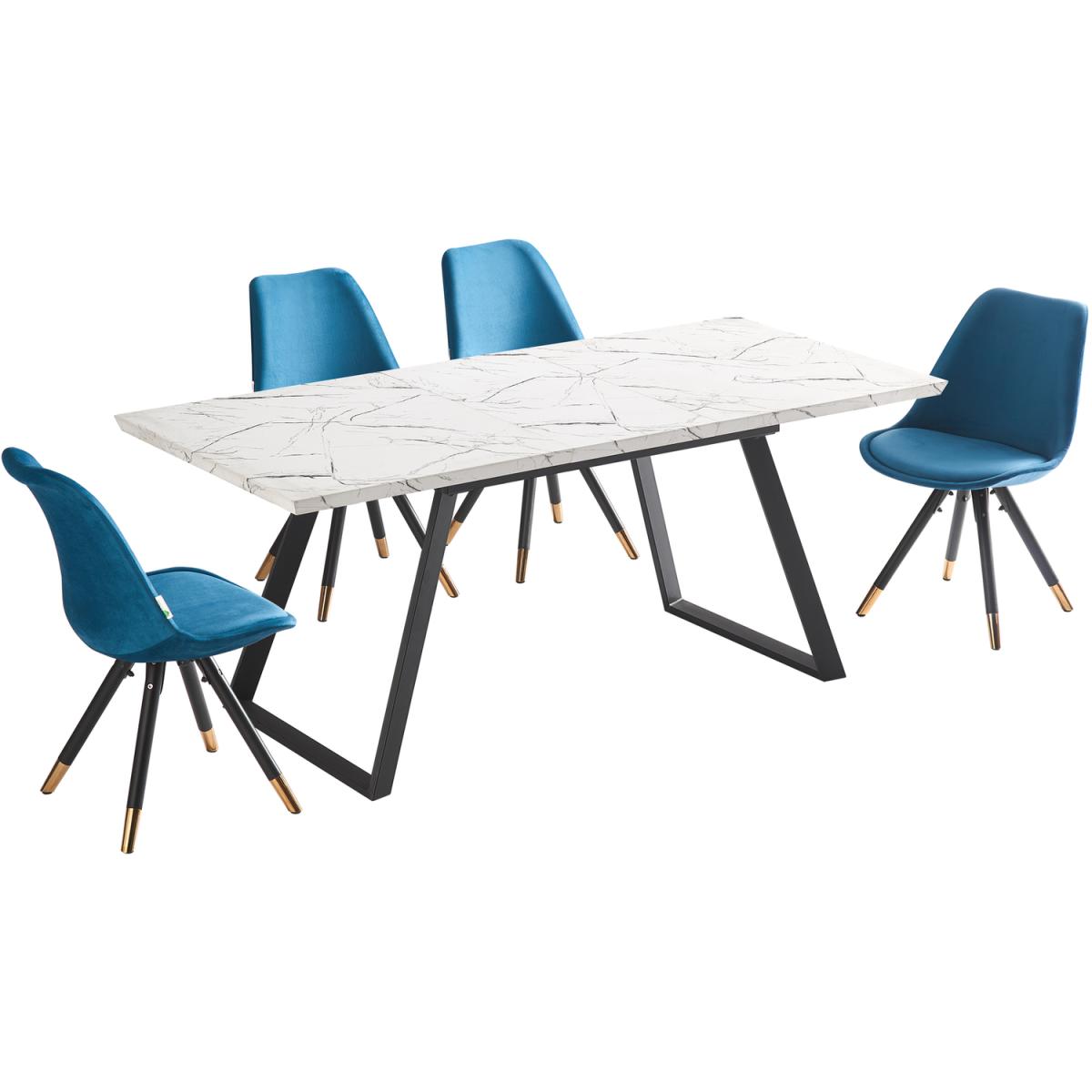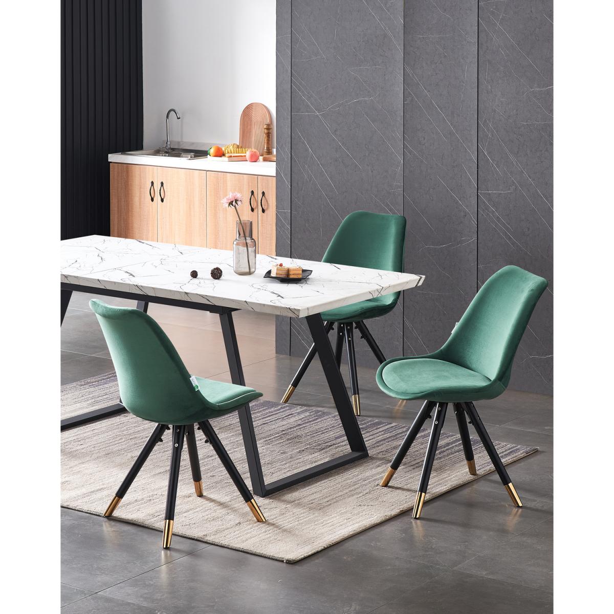 We are introducing the Sofia Toga dining set of 4 including the Toga Dining table that is extendable from 140 cm to 180 cm long giving you that extra space when you need it. Perfect whether it is a Traditional Dining set look or a Modern Dining Set look you are after. The table is supported by metal legs that provide not just sturdy support but a stunning and unique design that will get your guests talking. Comes with the Scandinavian and iconic Sofia faux leather cushioned Dining chairs, Curated with utmost care and precision to detail. The Chair features high-density foam cushioning with metal legs covered with gold end caps. The union between ergonomic construction and padded seating ensures comfort levels are premium. The style and comfort levels are simply unmatched. Modern design with simple lines complemented with delicate curves and upholstered in soft lush velvet. The dining set is ideal for the dining room, kitchen restaurant, and many more.