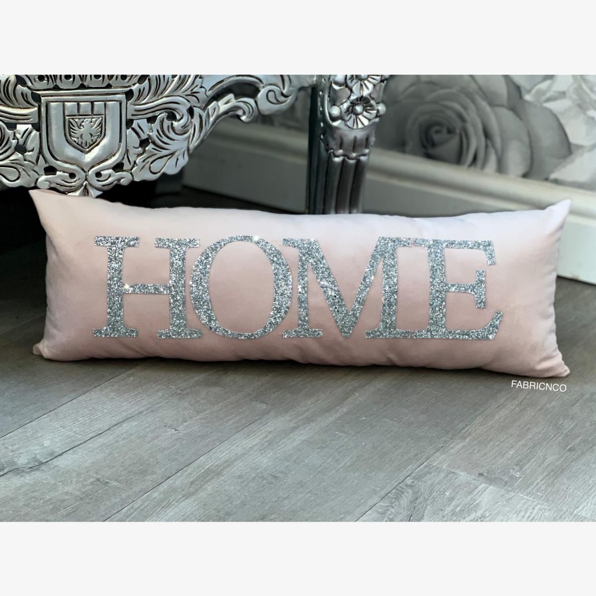 Gorgeous Home cushion finished off in a plush velvet soft pink fabric & glitter lettering spelling out Home. Each letter is sewn on individually so there is no way this will peel off. The cushion comes filled as shown in the photo.