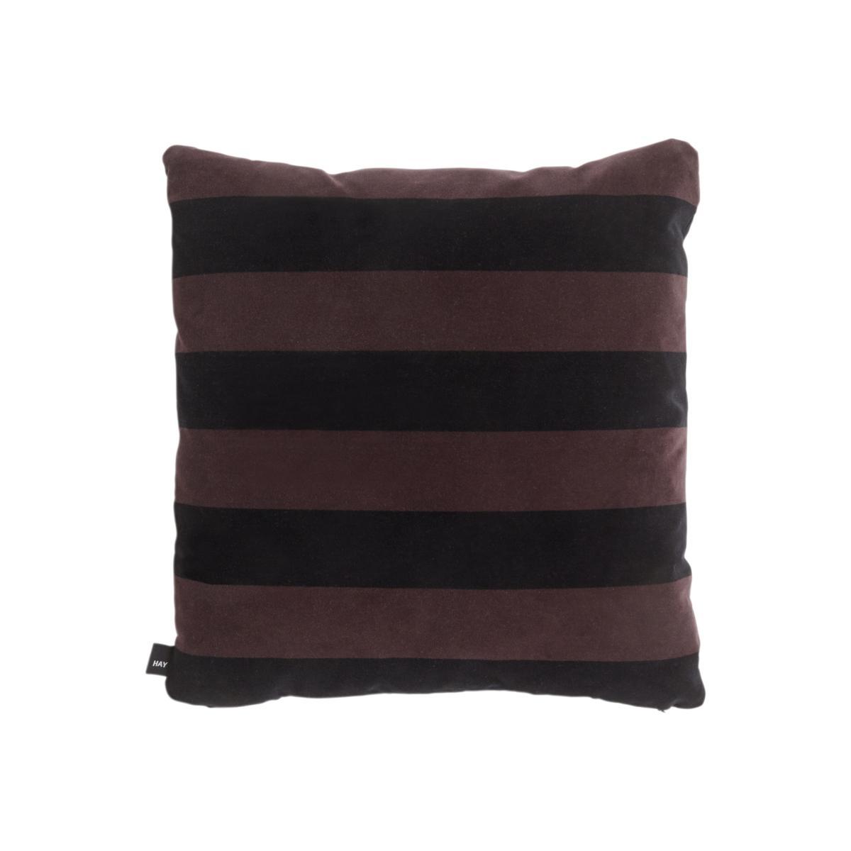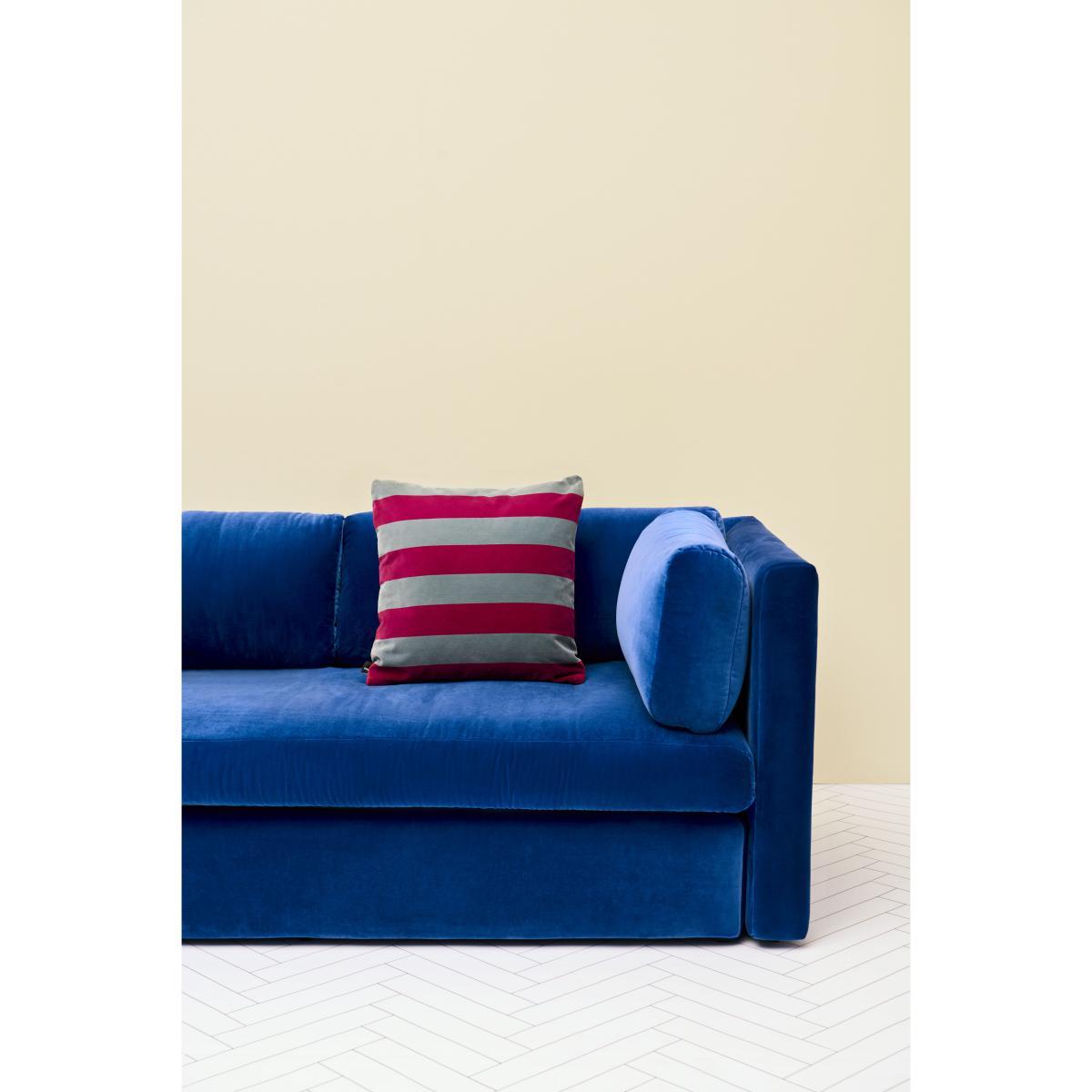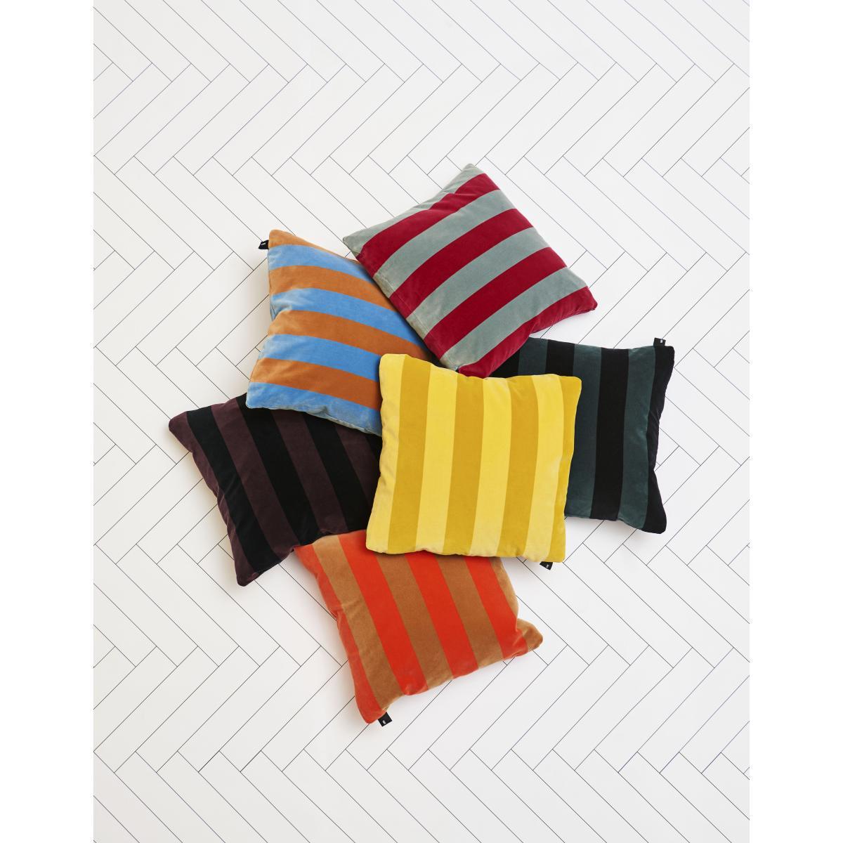 A vibrant style for these velours cushions decorated with large contrasting colourful strips. We love this geometric, graphical and modern pattern. Soft and silky, the velours has a luxurious look which is in sharp contrast with the range of jolly colours. The cushions' high-quality fabric and exceptional finishes are typical of the Hay Textile spirit.