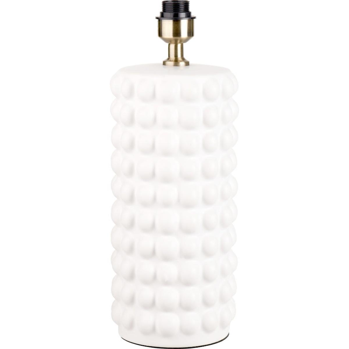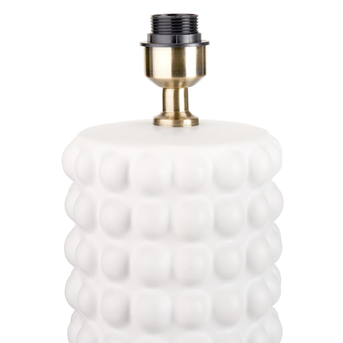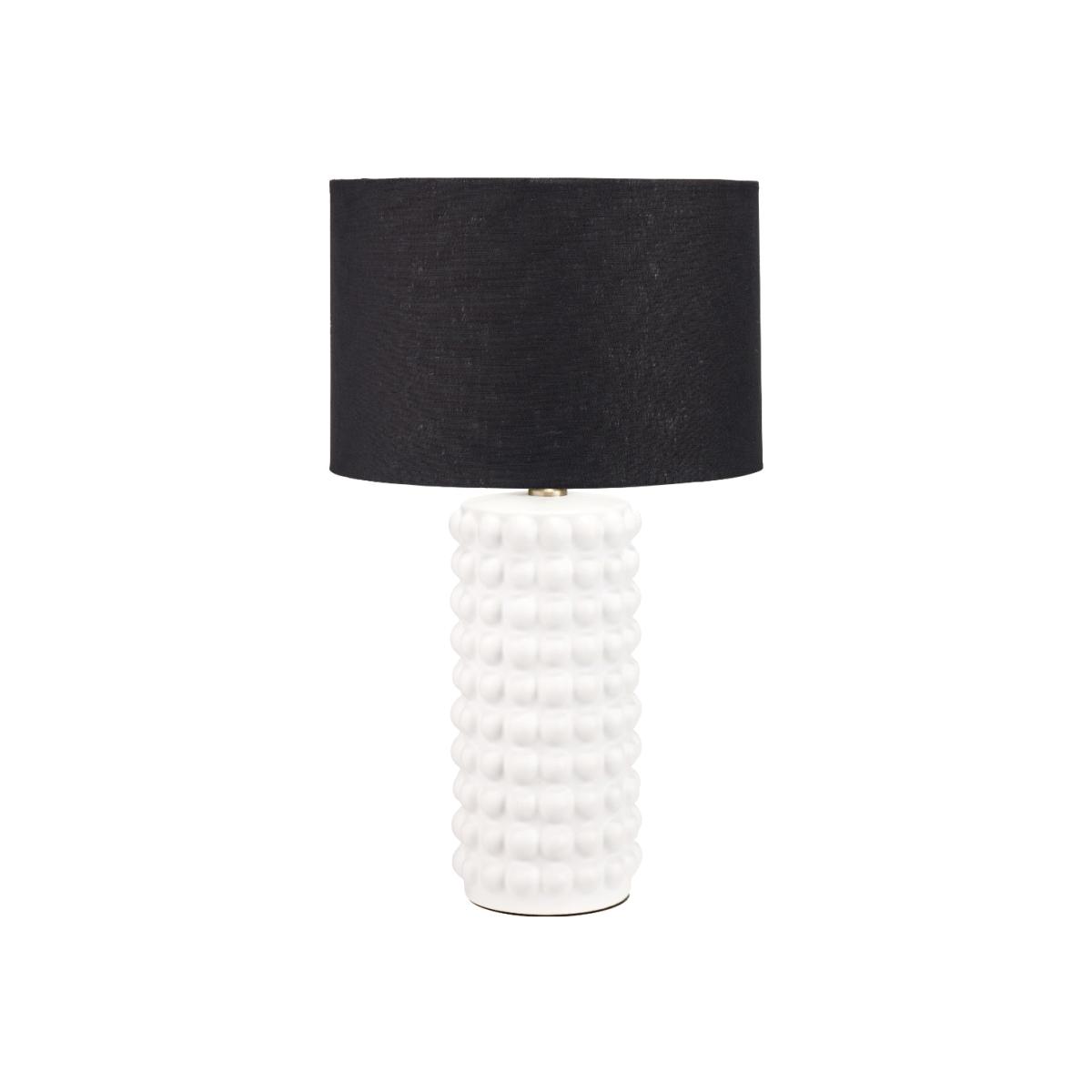 Enhance your living space with this tall, stylish ceramic bobble table lamp base. Its striking clean white finish and unique bobbles make it a standout piece that will elevate any room. The stunning table lamp is adorned with a modern black linen cylinder lamp shade to complete the look. Lamp Base Dimensions: H48xW19xD1. 9 cm Shade Dimensions: H27xW40xD4. 0 cm Requires 1x 10-12W LED ES27 bulb