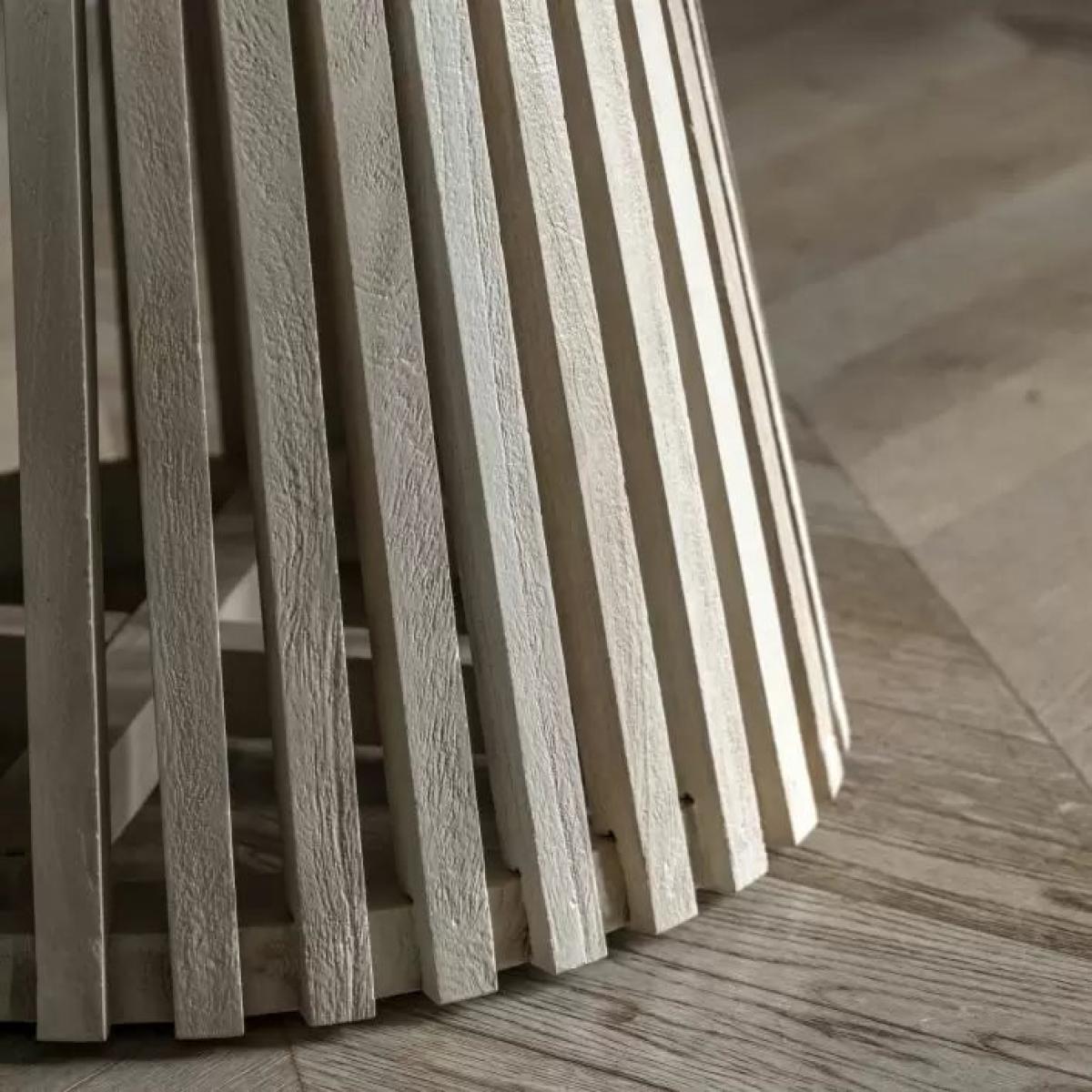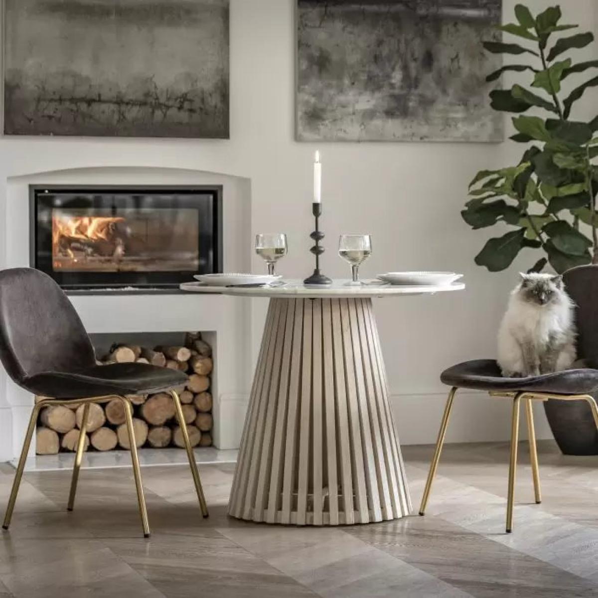 This lovely round dining table offers stylish contemporary design. The base is crafted from gently sloping slats of mango solid timbers with a white-washed, sand-blasted finish to create a striking design feature. This stunning base is paired with a beautiful white Indian marble top, creating a classy, elegant piece of furniture. Matching items are available.