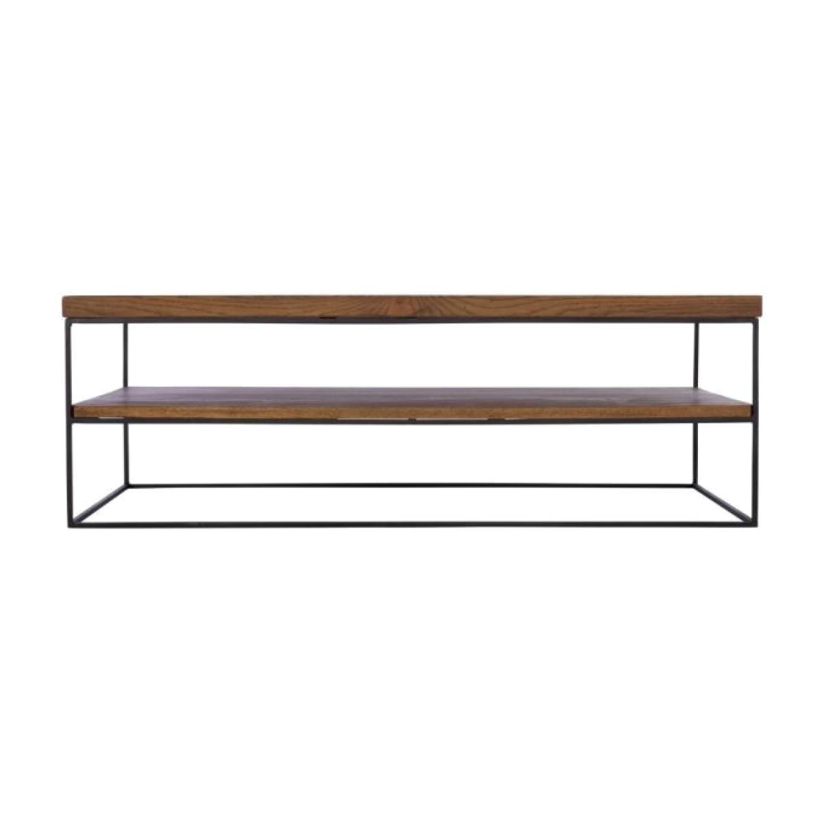 Solid Oak Produced from 100% solid European oak, with a mid-tone finish applied to enhance the natural beauty of the oak, this coffee table is packed with industrial charm. Resting on an industrial metal frame, the sturdy oak table top with a handy shelf beneath are large and spacious. Dimensions - 42cm H x 120cm W x 70cm D Assembly required
