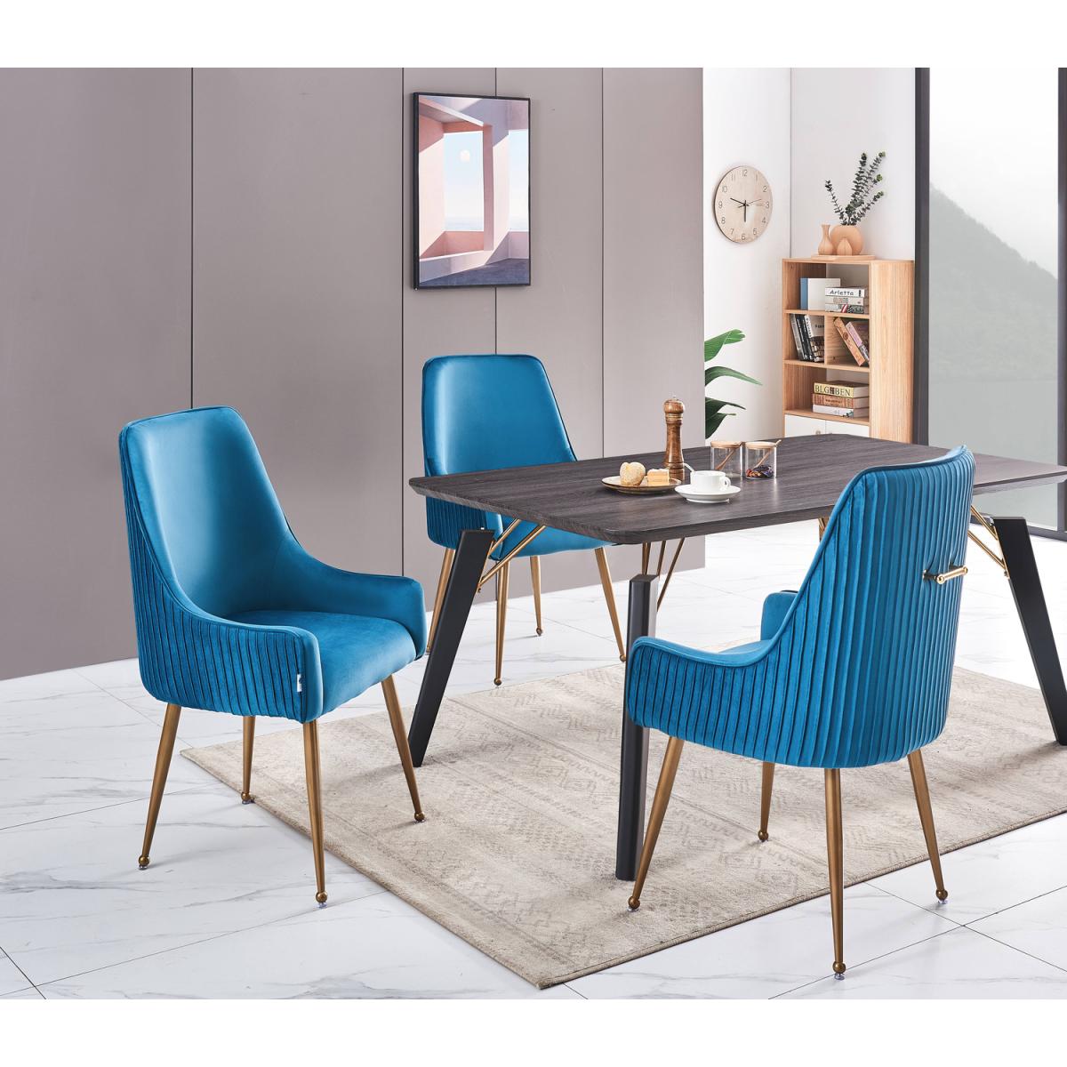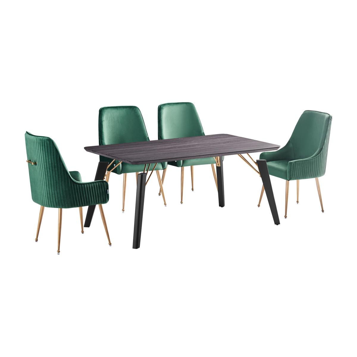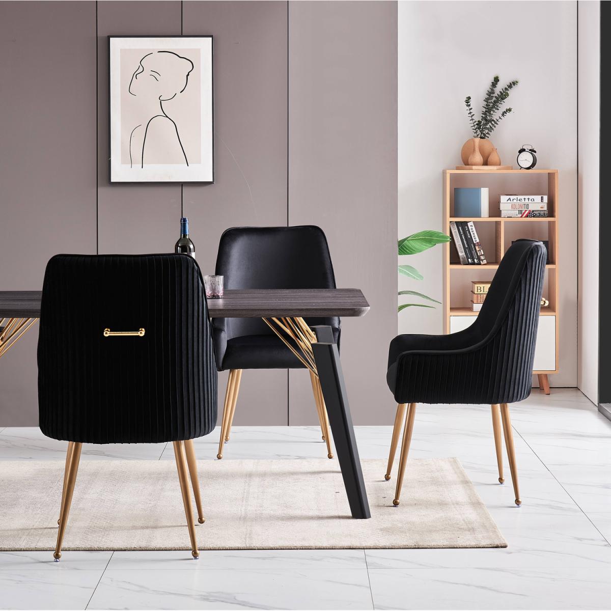 Introducing the dining set that includes the cosmo dinette Table featuring precision and a luxury finish to deliver an amazing dining experience. The sleek design of this table is giving it both functionality and a modern look with a touch of a rustic home feel. The wooden top gives it a warm rustic feel while the black metal legs with a gold chrome frame bring the modern feel. The table comes with Soho kitchen chairs that evoke notions of grandeur and sophistication. Wonderfully upholstered with a premium quality plush velvet to meet expectations, we have had to go into high levels of detail to secure this look with a modern twist. While adorned with a contemporary gold finished handle with contrasting brushed brass metal legs. Featuring a modern curved back with armrests and a well-padded seat, supported by four sturdy metal legs that have floor protectors to protect your floor from scratching. This dining chair is so ergonomic and provides your low back and spine enough support for a long-term relaxation. These chairs will help add a dose of sophistication to any interior. Sloping armrests, gold accents, decorative pull ring, and pleated back.