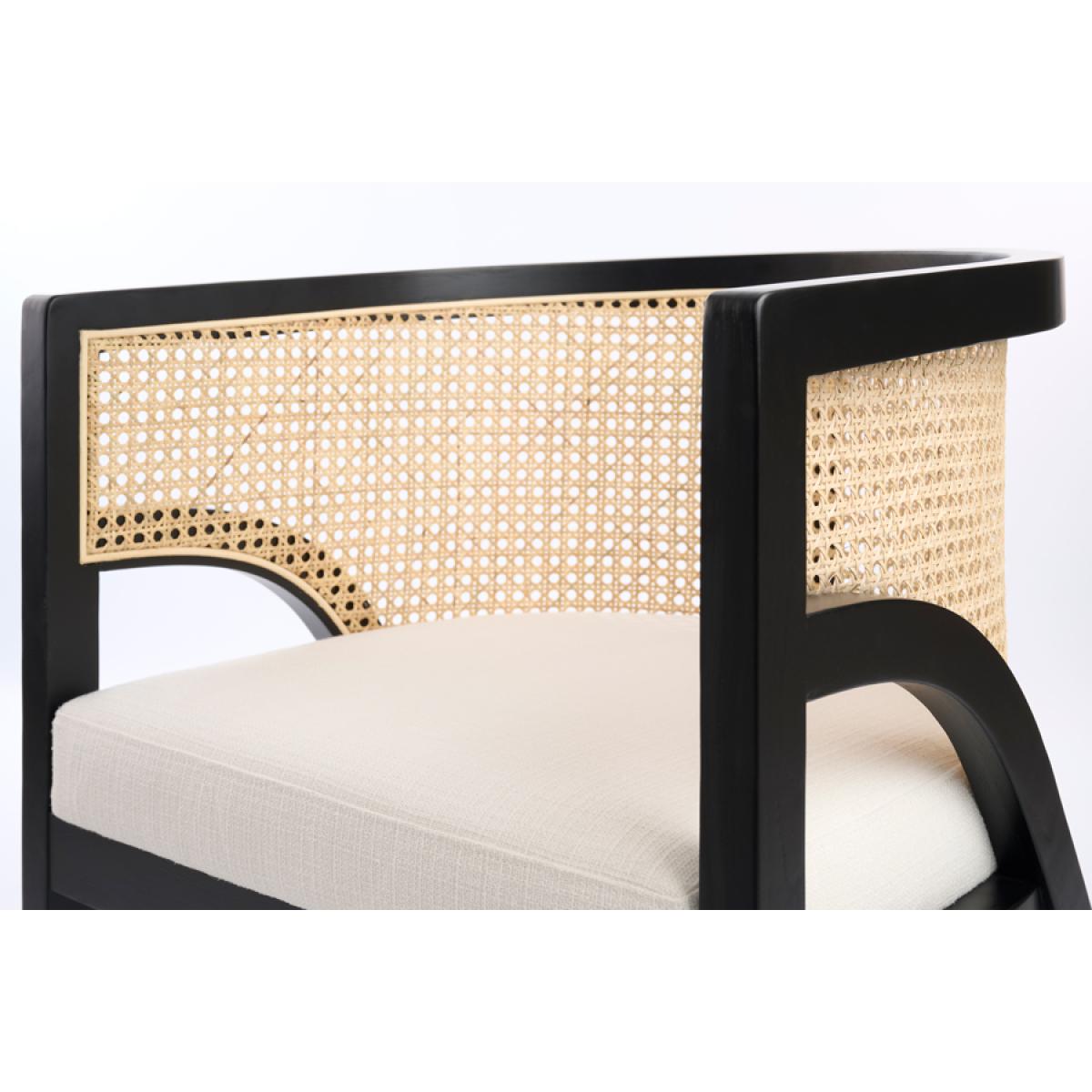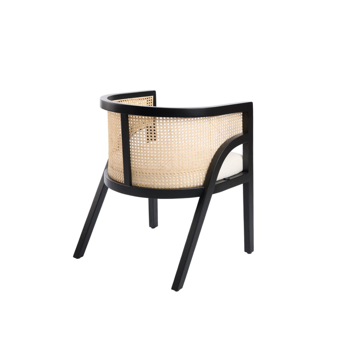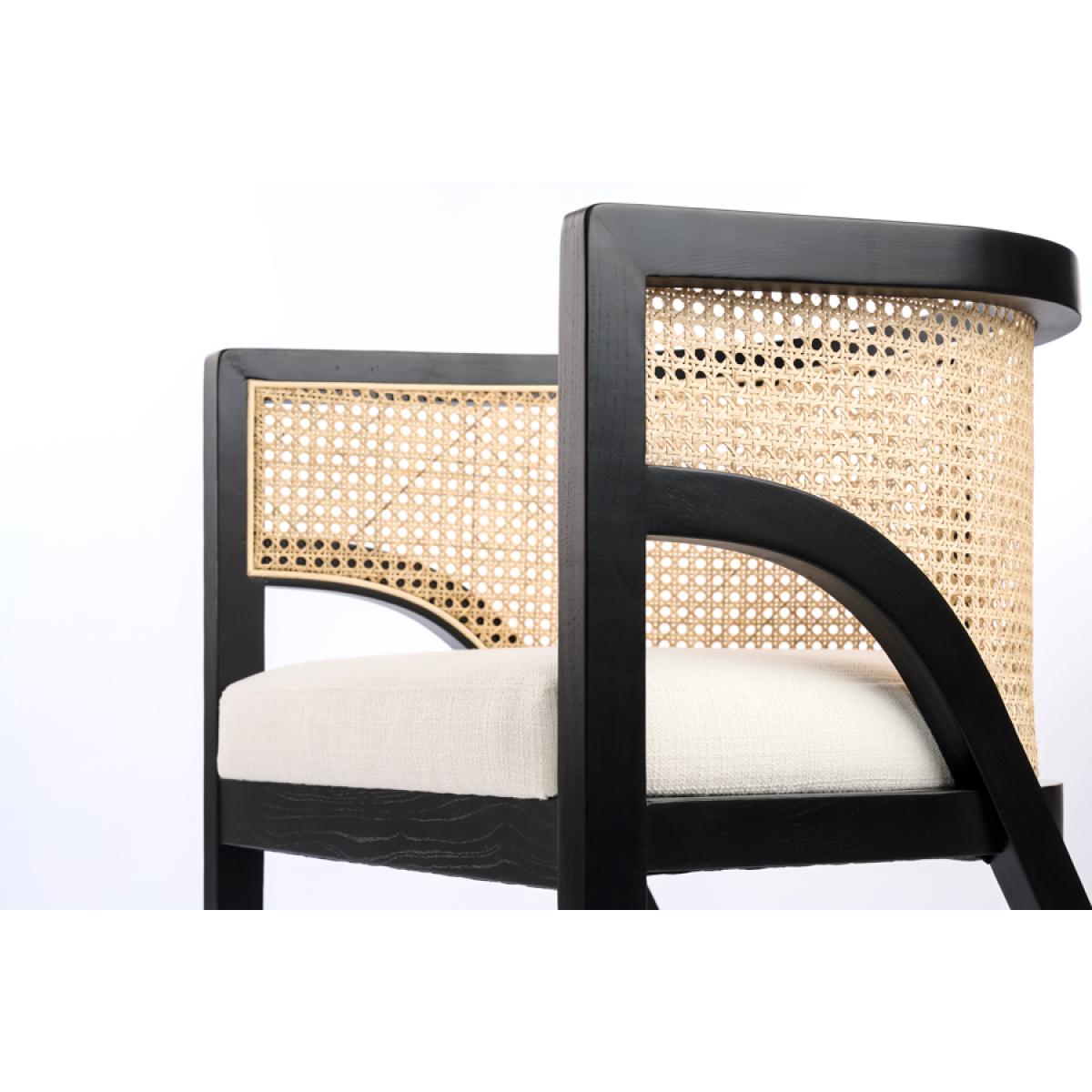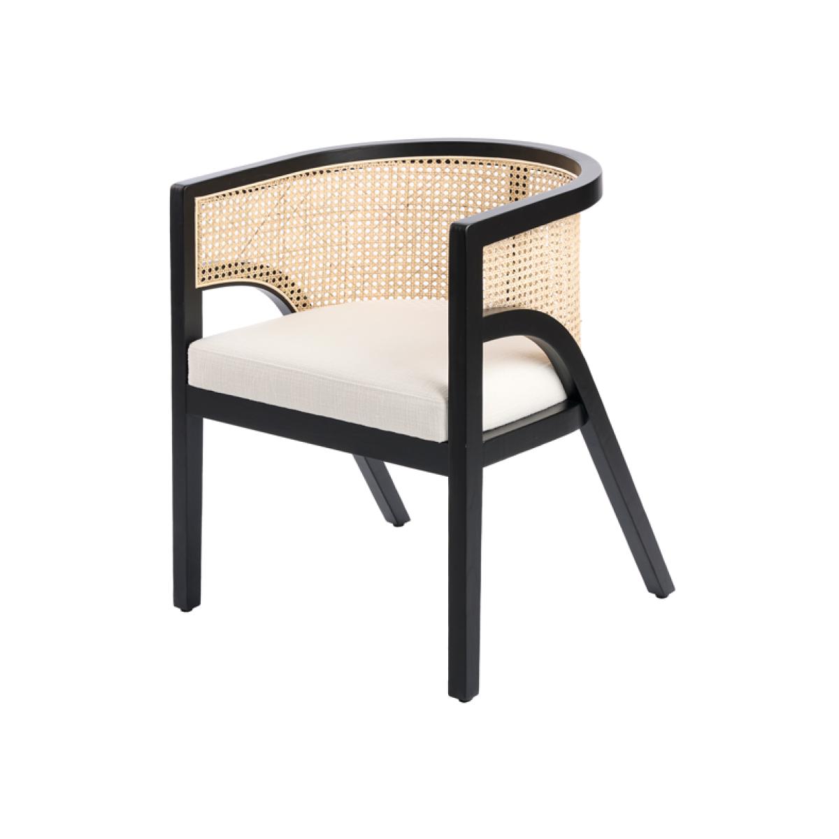 A classic, elegant dining chair with a distinctive dynamic shape. Solid ash wood with satin black lacquer. Natural woven cane detailing. Ivory coloured linen effect fabric. Soft and comfortable padded seat. Supplied fully assembled.