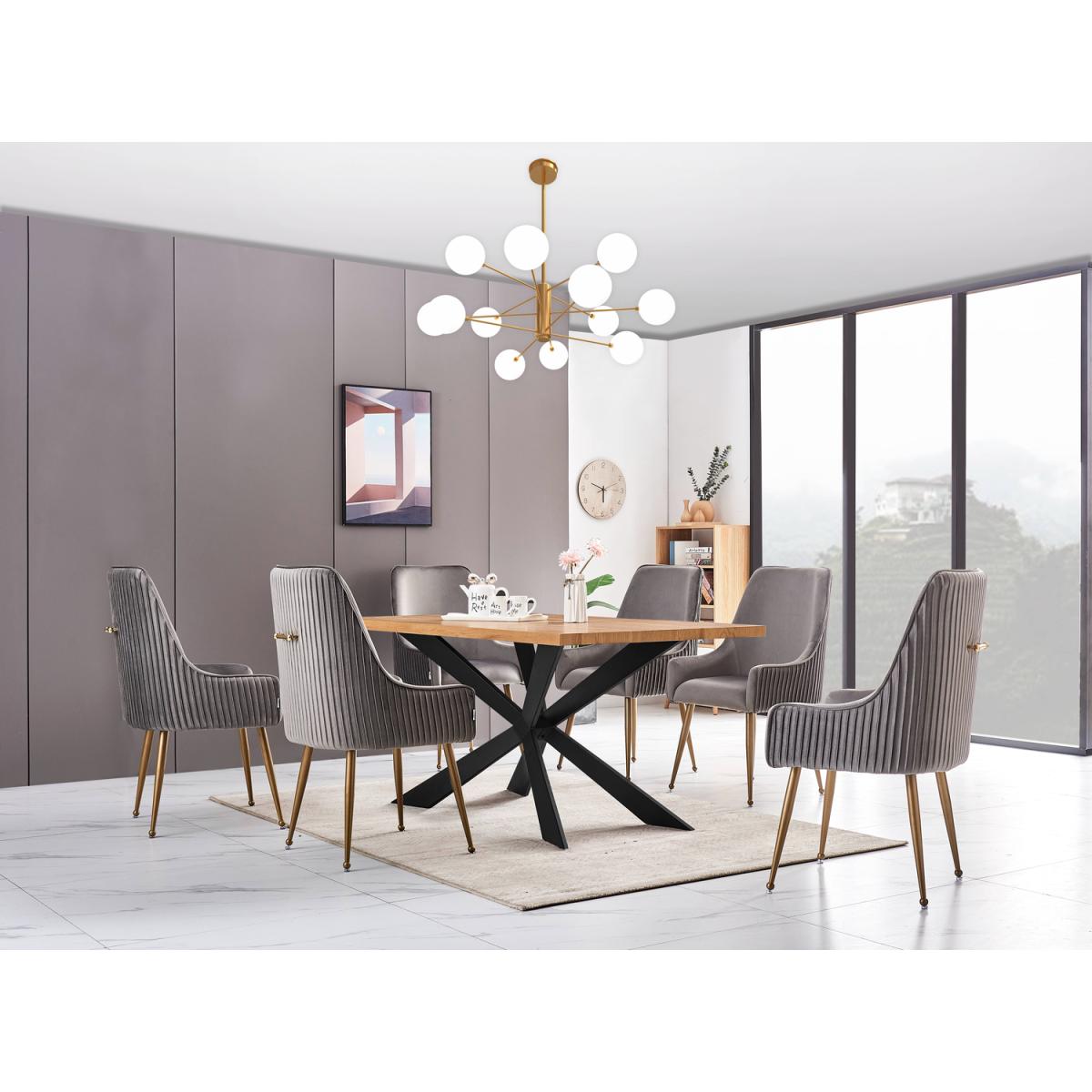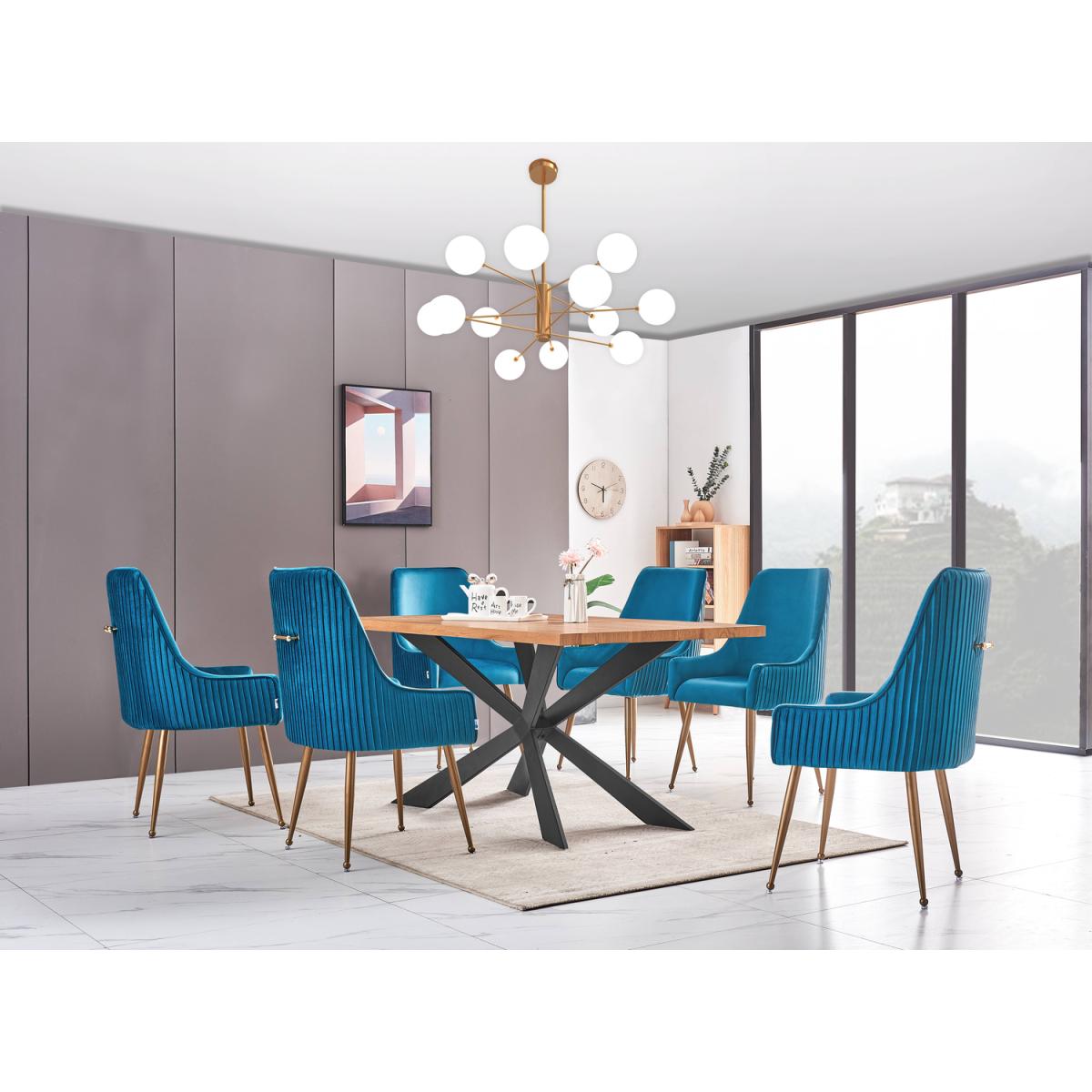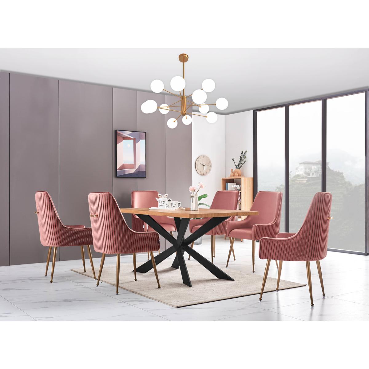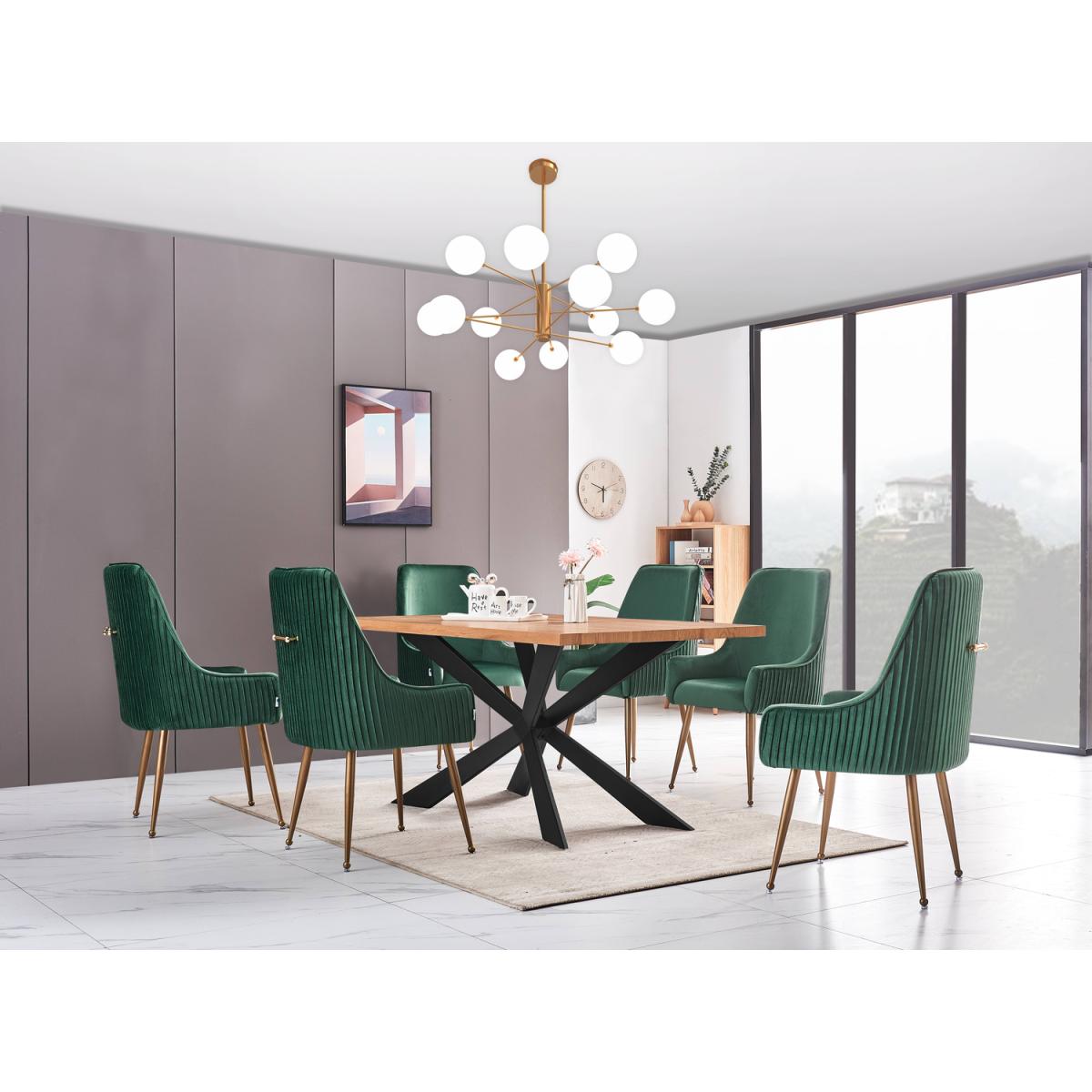 Introducing the dining set that includes the dinette Table featuring a simplistic and versatile design with a twist! It has been designed with precision and a luxury finish to deliver an amazing dining experience. The striking metal base with a cross design demands attention all eyes on me. The legs feature floor protectors to avoid scratching your floors. Its luxury yet simple design will elevate your dining space to a new level. The table comes with Soho kitchen chairs that evoke notions of grandeur and sophistication. Wonderfully upholstered with a premium quality plush velvet to meet expectations, we have had to go into high levels of detail to secure this look with a modern twist. While adorned with a contemporary gold finished handle with contrasting brushed brass metal legs. Featuring a modern curved back with armrests and a well-padded seat, supported by four sturdy metal legs that have floor protectors to protect your floor from scratching. This dining chair is so ergonomic and provides your low back and spine enough support for a long-term relaxation. These chairs will help add a dose of sophistication to any interior. Sloping armrests, gold accents, decorative pull ring, and pleated back.