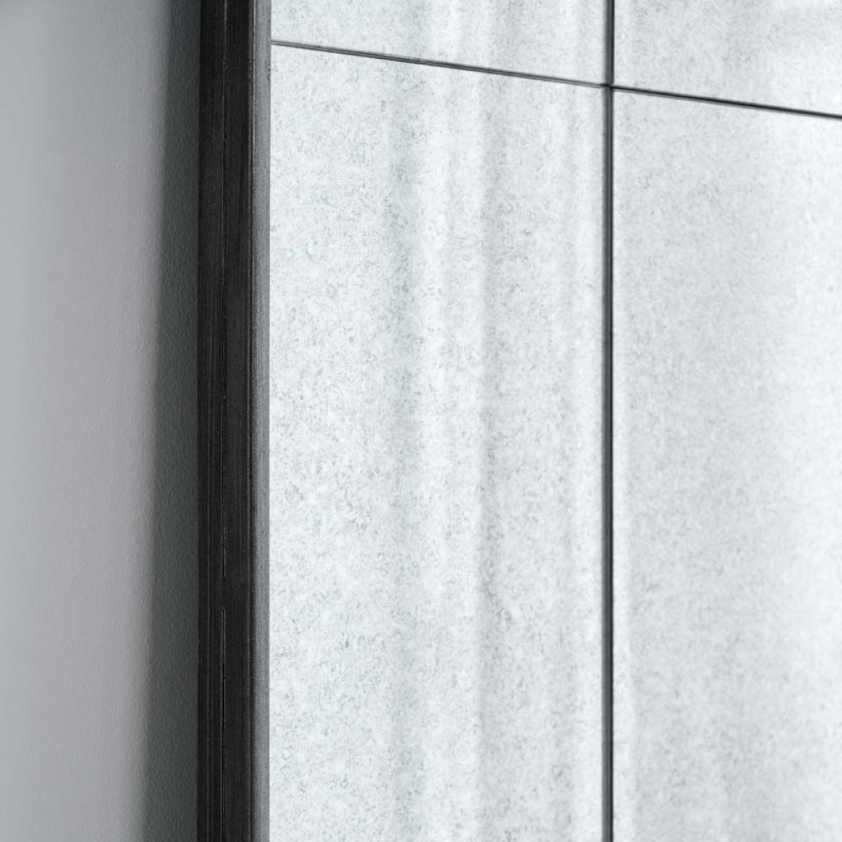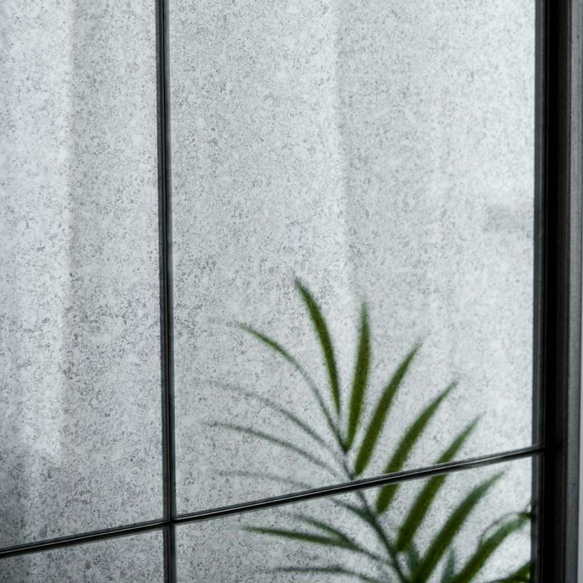 The Soho Leaner mirror is huge and striking mirror. Its glass is distressed with a light patina and features multiple pains in a grid pattern. The frame of the mirror is a tarnished silver coloured metal and being thin in profile makes the most of the large expanse of mirrored glass. This mirror is heavy and is designed to lean, but it does have fittings to allow hanging too, but we would recommend very strong and deep wall plugs are used, and to choose a solid rather than stud wall.