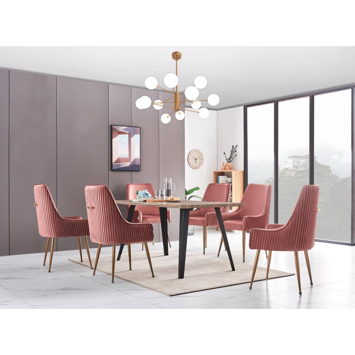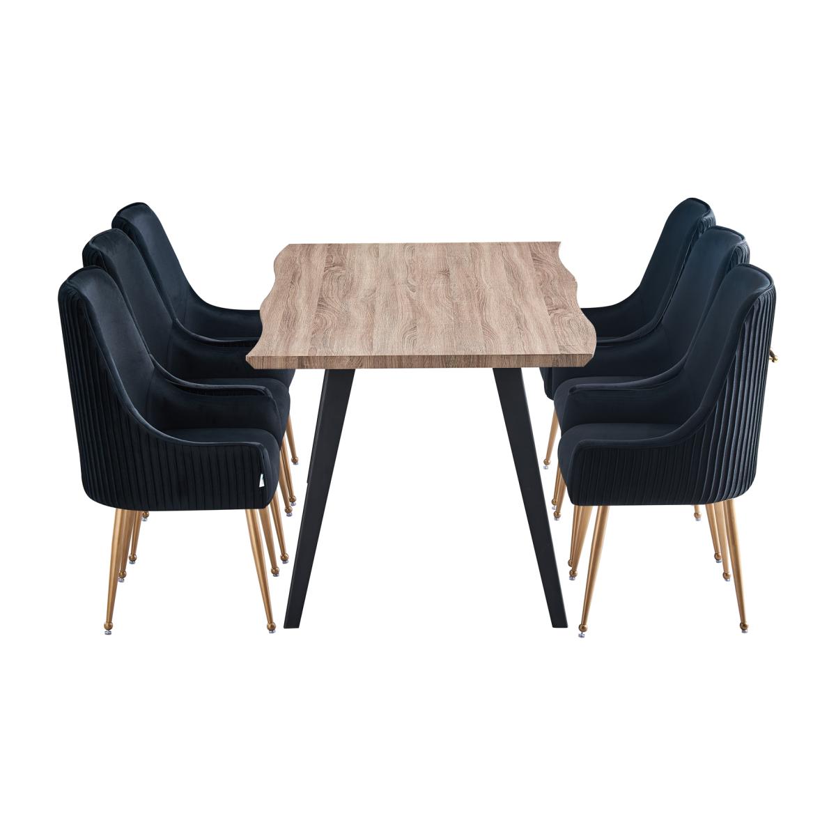 Introducing the dining set includes the Rocco dining table that suits a wide variety of interior looks. Sturdy yet space-enhancing, its shape is timelessly minimalist. A perfect table for everyday family mealtimes, as well as an excellent table for grownup dinner gatherings. The slightly splayed powder-coated metal legs give a sharp modern feel, whilst the wooden finish top emphasizes natural wavy edges. The table comes with Soho kitchen chairs that evoke notions of grandeur and sophistication. Wonderfully upholstered with a premium quality plush velvet to meet expectations, we have had to go into high levels of detail to secure this look with a modern twist. While adorned with a contemporary gold finished handle with contrasting brushed brass metal legs. Featuring a modern curved back with armrests and a well-padded seat, supported by four sturdy metal legs that have floor protectors to protect your floor from scratching. This dining chair is so ergonomic and provides your low back and spine enough support for a long-term relaxation. These chairs will help add a dose of sophistication to any interior. Sloping armrests, gold accents, decorative pull ring, and pleated back.
