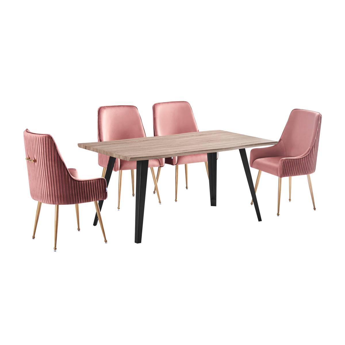 Introducing the dining set includes the Rocco dining table that suits a wide variety of interior looks. Sturdy yet space-enhancing, its shape is timelessly minimalist. A perfect table for everyday family mealtimes, as well as an excellent table for grownup dinner gatherings. The slightly splayed powder-coated metal legs give a sharp modern feel, whilst the wooden finish top emphasizes natural wavy edges. The table comes with Soho kitchen chairs that evoke notions of grandeur and sophistication. Wonderfully upholstered with a premium quality plush velvet to meet expectations, we have had to go into high levels of detail to secure this look with a modern twist. While adorned with a contemporary gold finished handle with contrasting brushed brass metal legs. Featuring a modern curved back with armrests and a well-padded seat, supported by four sturdy metal legs that have floor protectors to protect your floor from scratching. This dining chair is so ergonomic and provides your low back and spine enough support for a long-term relaxation. These chairs will help add a dose of sophistication to any interior. Sloping armrests, gold accents, decorative pull ring, and pleated back.