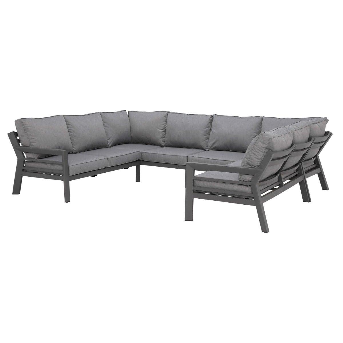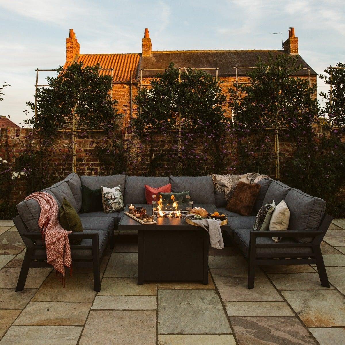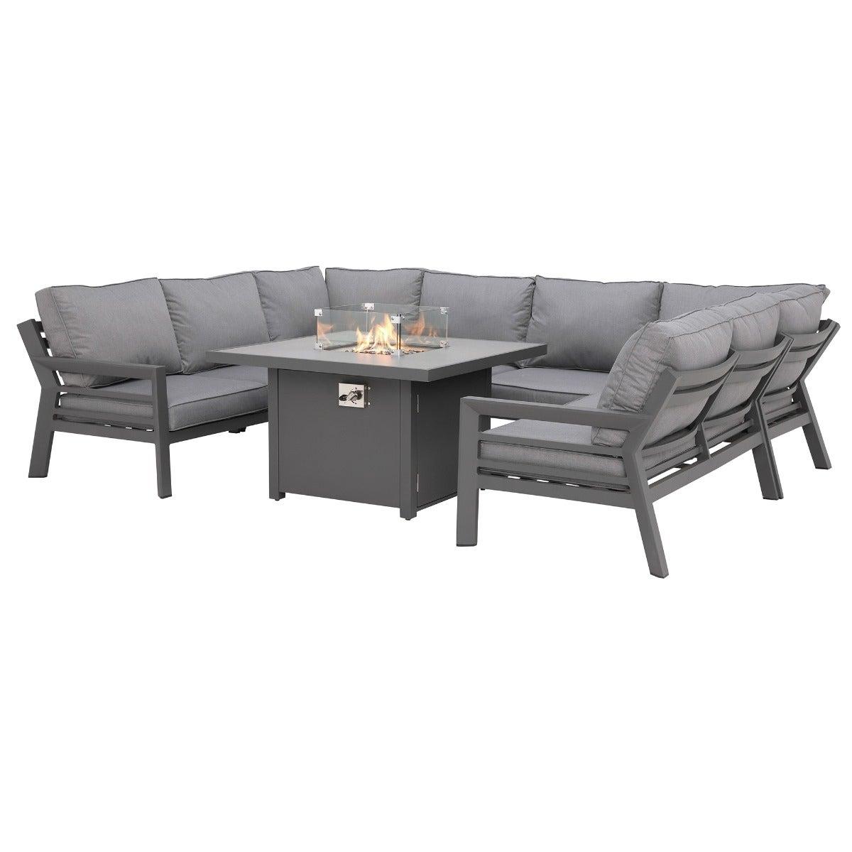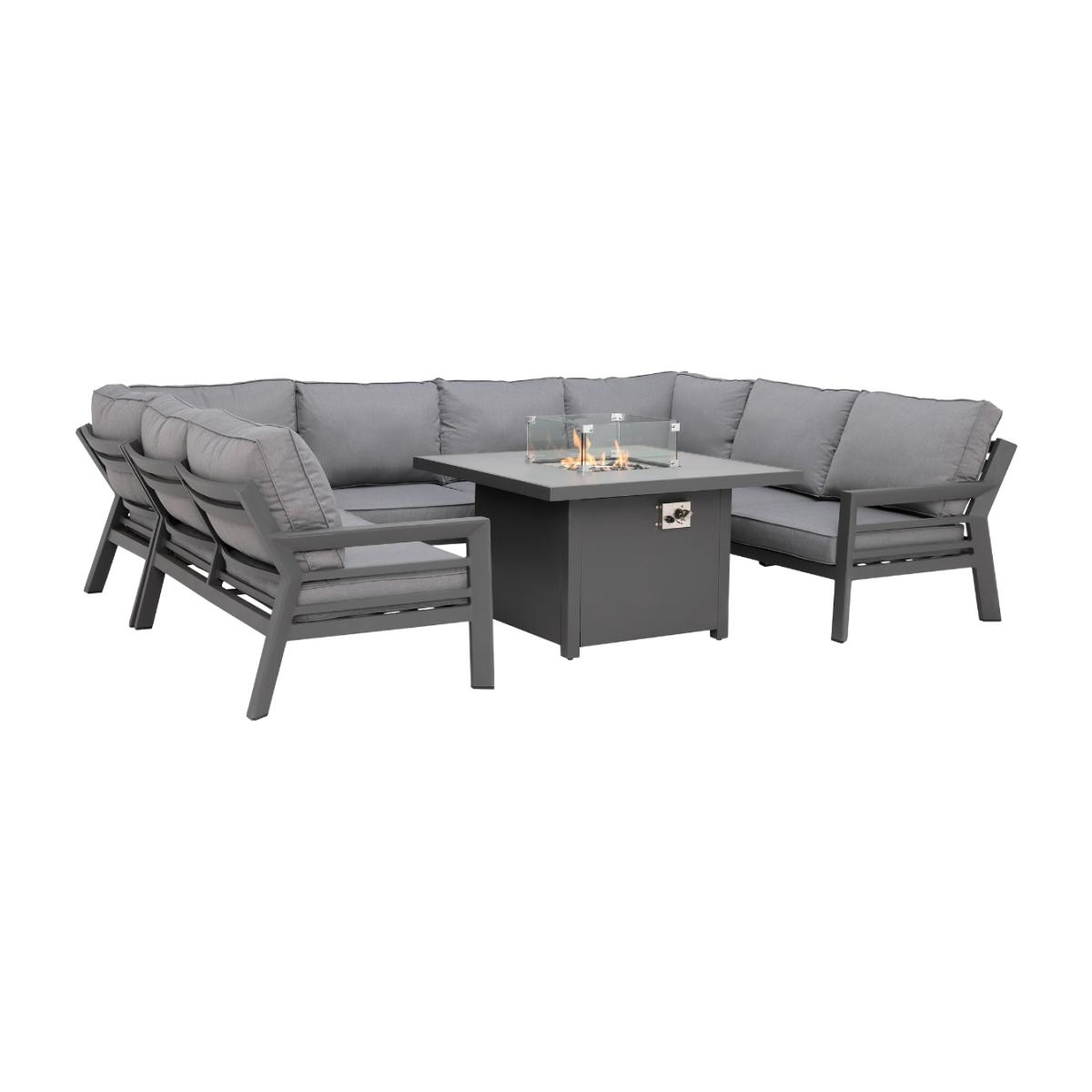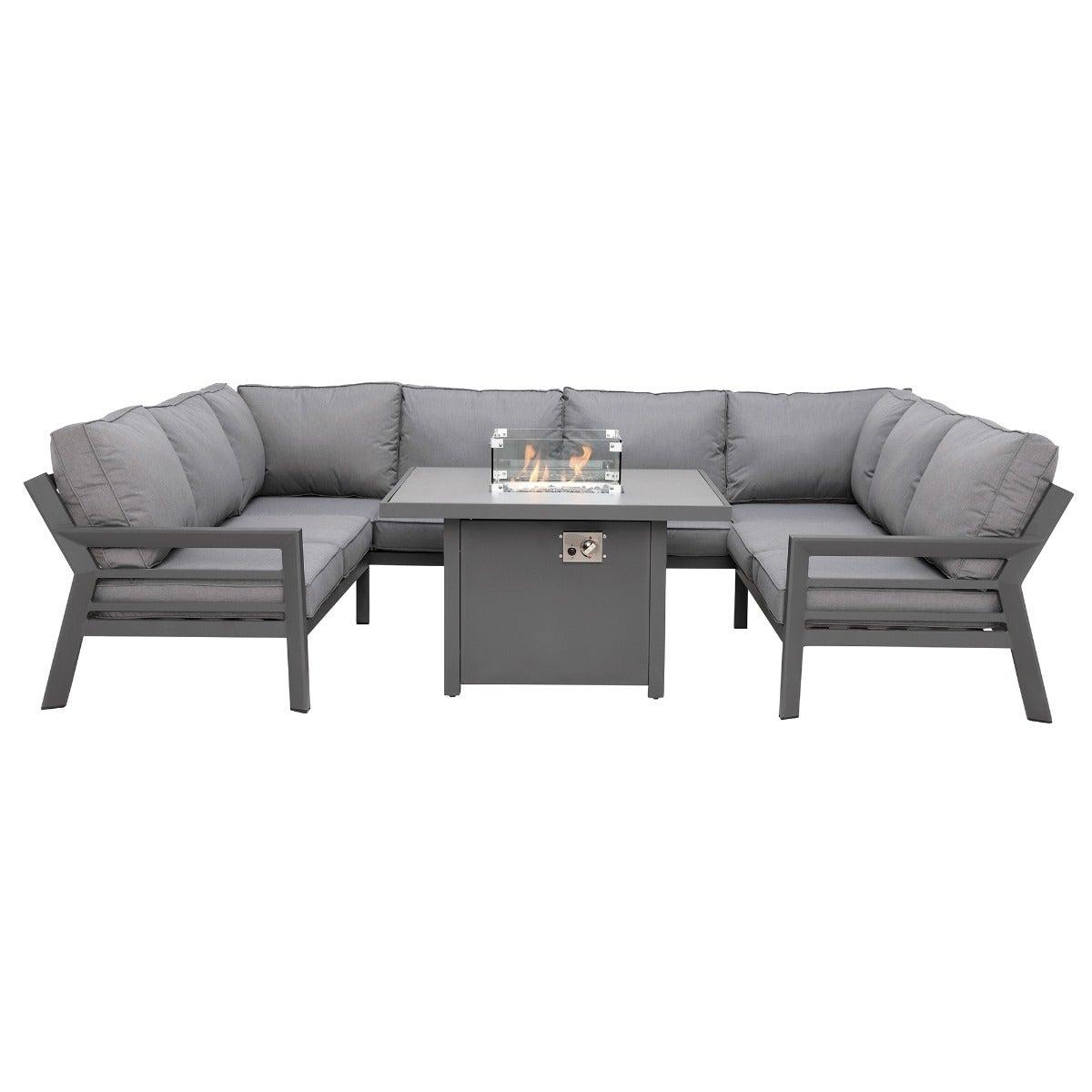 Design. Get that high end restaurant terrace feel in the comfort of your own back garden. With the Soho U-Shaped Sofa Set with Fire Pit, Grey. Masterfully crafted to suit any. Garden. Space,. The powder-coated. Aluminium. Frame is weather-resistant. And can stay. Outdoors. All year round. The table is complete with a stand-out feature of a fire pit, effortlessly creating a warming, cozy atmosphere when the night starts drawin. G in. The spacious U-Shaped sofa is perfectly finished with soft, supportive cushioning and will allow you. And all your guests to. Socialize. All night long.