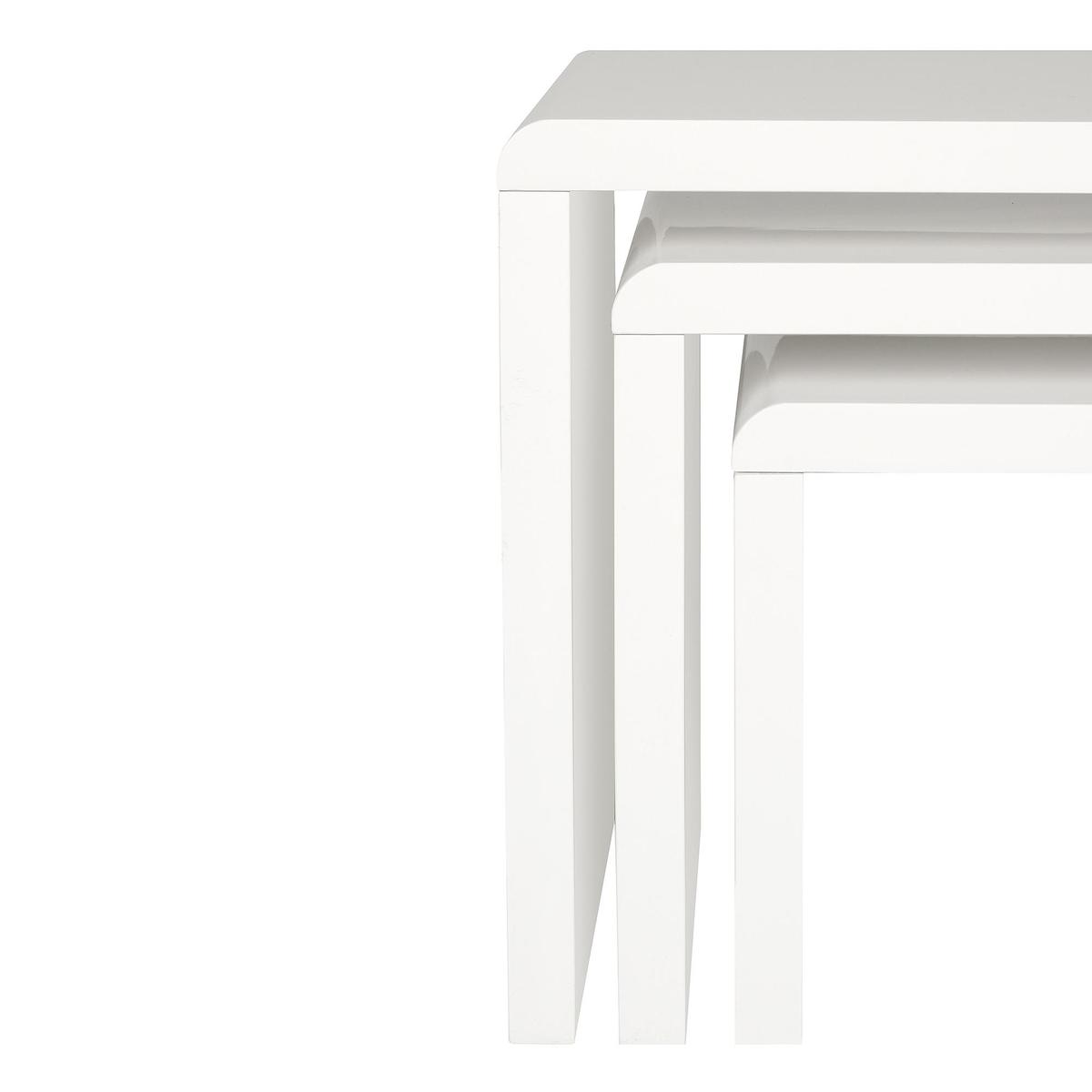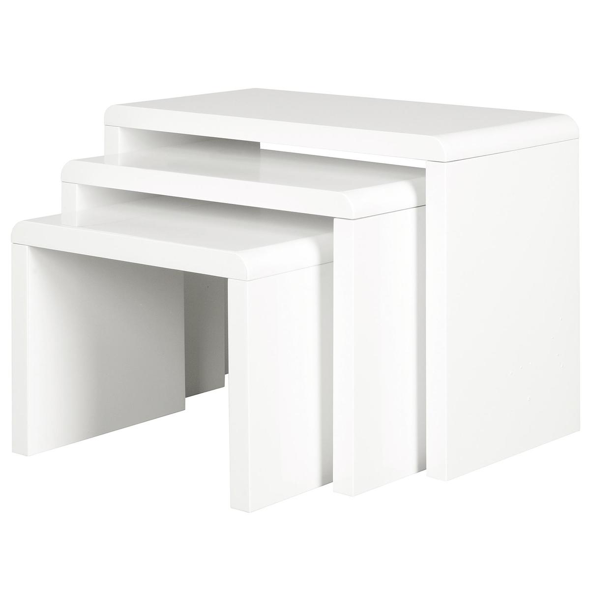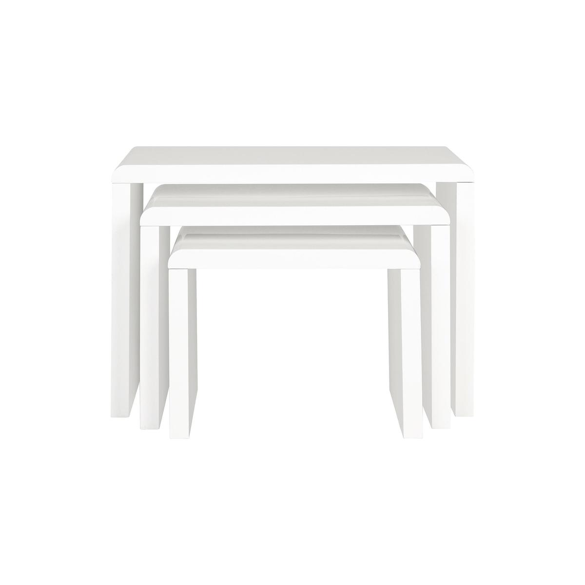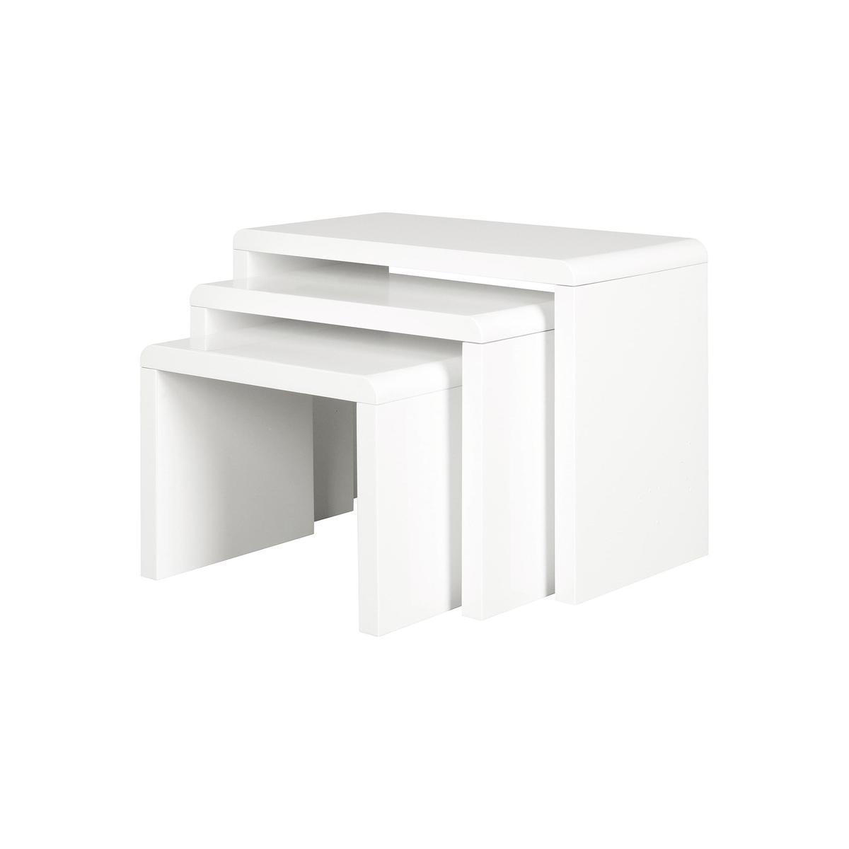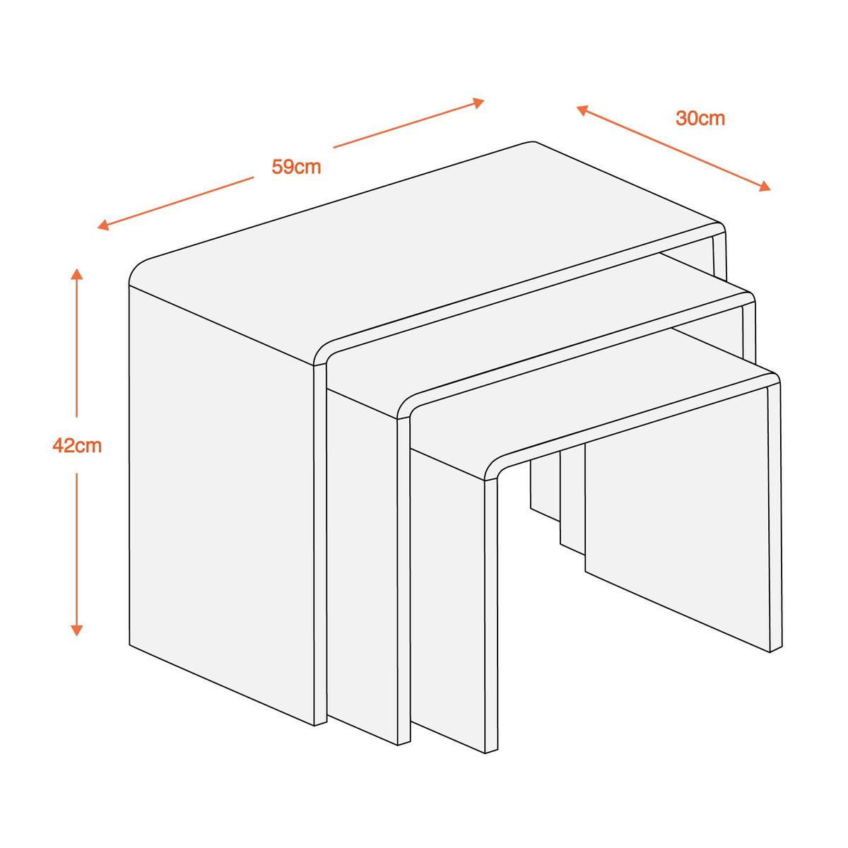 Dunelm Exclusive - Designed and Developed by Dunelm. Featuring a high gloss finish and subtly curved edges, this set of three Soho nest of tables boast a compact design and have been crafted from durable materials. Table measurements:. Large: H42.5cm x W 59cm x D 29.5cm. Medium: H 35cm x W 49cm x D 29.5cm. Small: H 28cm x W 39.5cm x D 29.5cm.