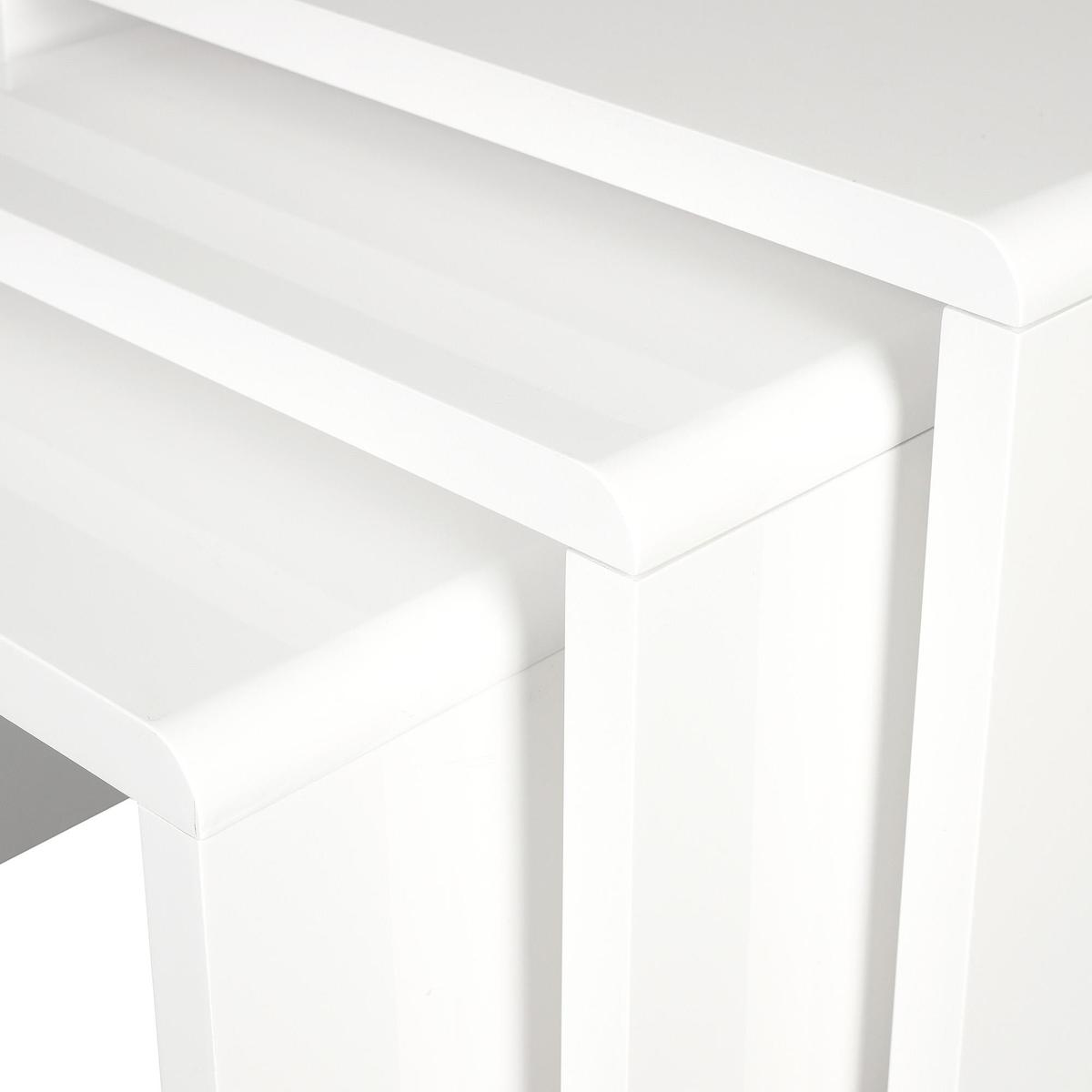 I love this set of nesting tables for their versatile and sleek design, making them a practical choice for smaller or contemporary spaces. The glossy white finish adds a crisp, modern touch that easily complements neutral tones or colour pops, and they work well in both minimalist and eclectic interiors. Styling tips include stacking them neatly to save space, or spreading them out to create different levels for plants, lamps, or decorative accessories. Their neutral look makes them adaptable - perfect for brightening a monochrome scheme or adding structure in a more layered, textured setting. They’re a functional focal point that can be styled simply or with more curated accessories depending on your space and mood.