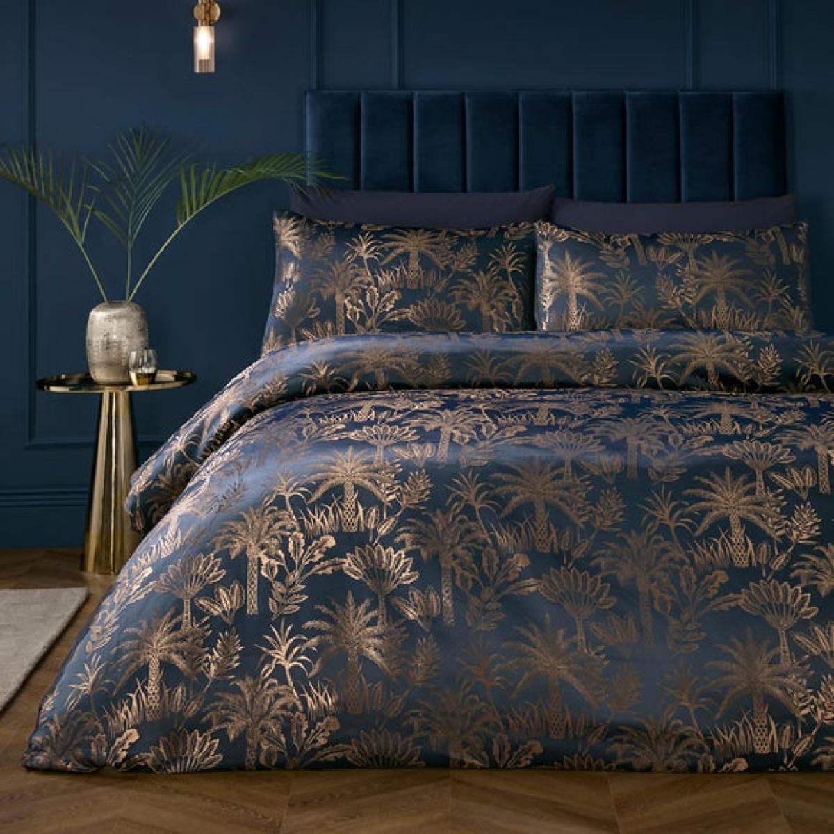 I love this bedding set for its bold, sophisticated look - the midnight navy paired with the metallic palm print adds a touch of luxe without feeling overly formal. It works particularly well in contemporary or modern interiors where you want a statement piece that still feels sleek and stylish. To style it effectively, keep the rest of the room relatively simple-think minimal furniture and neutral or matching accents, like pairing with navy or gold accessories. For added texture, consider layering with plush cushions or throws in complementary colours to create a cosy yet chic vibe. It’s a versatile choice that can elevate your bedroom decor by adding a refined, evening-inspired aesthetic.