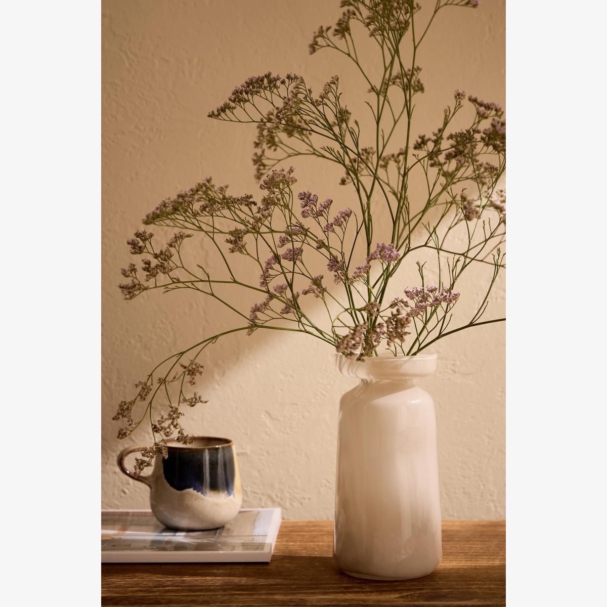 I love this glass vase for its simple yet elegant silhouette, which makes it versatile for various interiors. It works particularly well in minimalistic or modern spaces, adding a touch of understated sophistication. The mouth-blown glass technique gives it a handcrafted feel, making each piece unique. For styling, I recommend pairing it with dried or understated fresh blooms to highlight its organic shape, or using it as a standalone sculptural object on a mantle or sideboard. It’s ideal for creating a relaxed, curated look, especially in neutral-toned interiors or for injecting subtle texture into more eclectic settings.