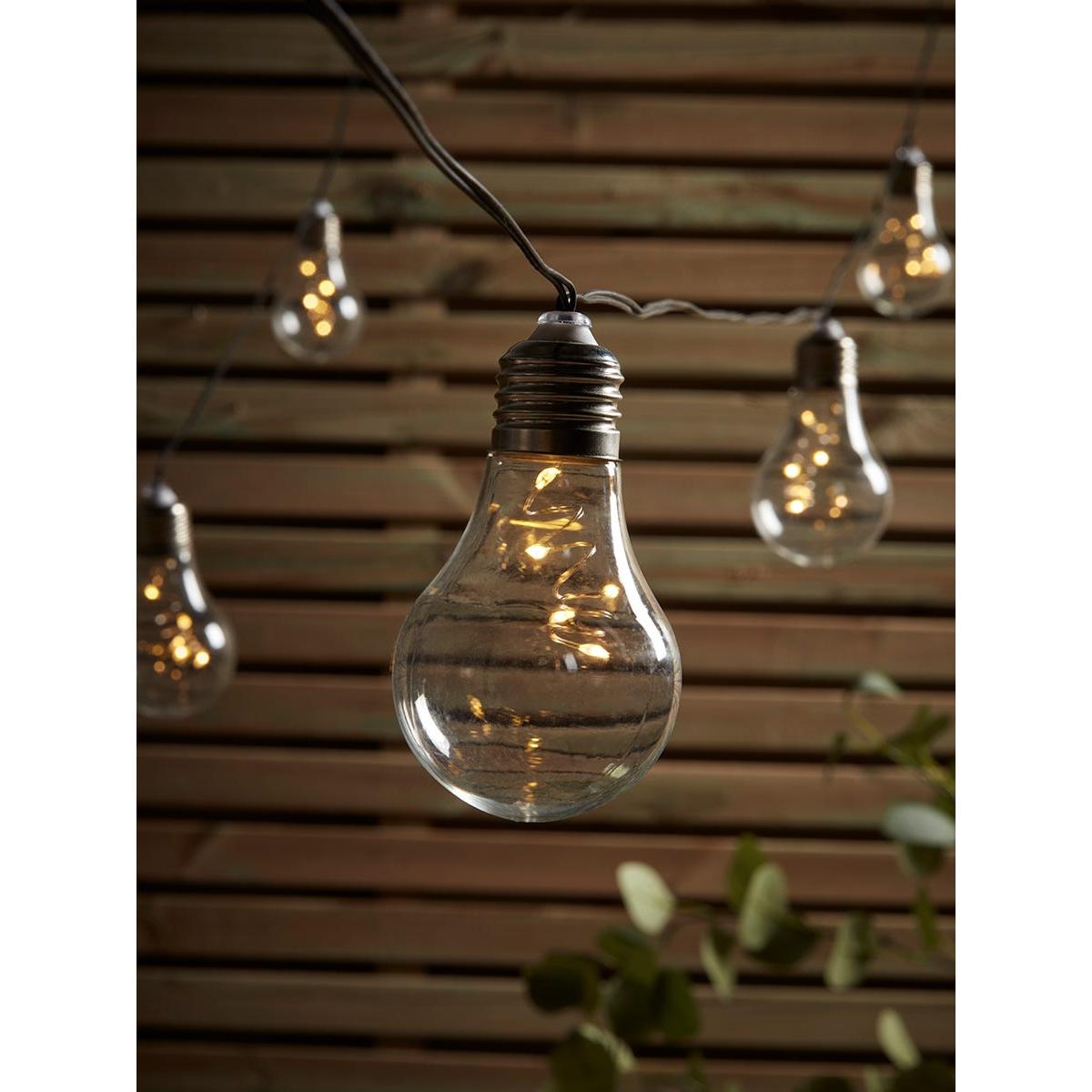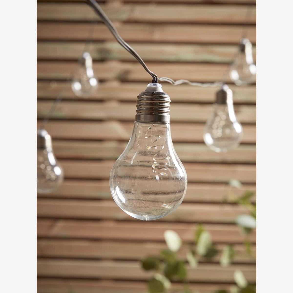 A classic festoon with traditional lightbulbs, offering a warm white glow with the bonus of being solar powered. Each bulb has a string with a wire of five LEDs inside. This string offers 10 lightbulbs at 50cm intervals across its length and can be set to either a static or flashing effect.