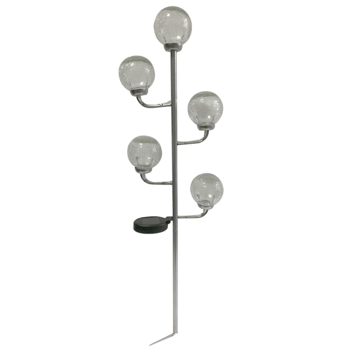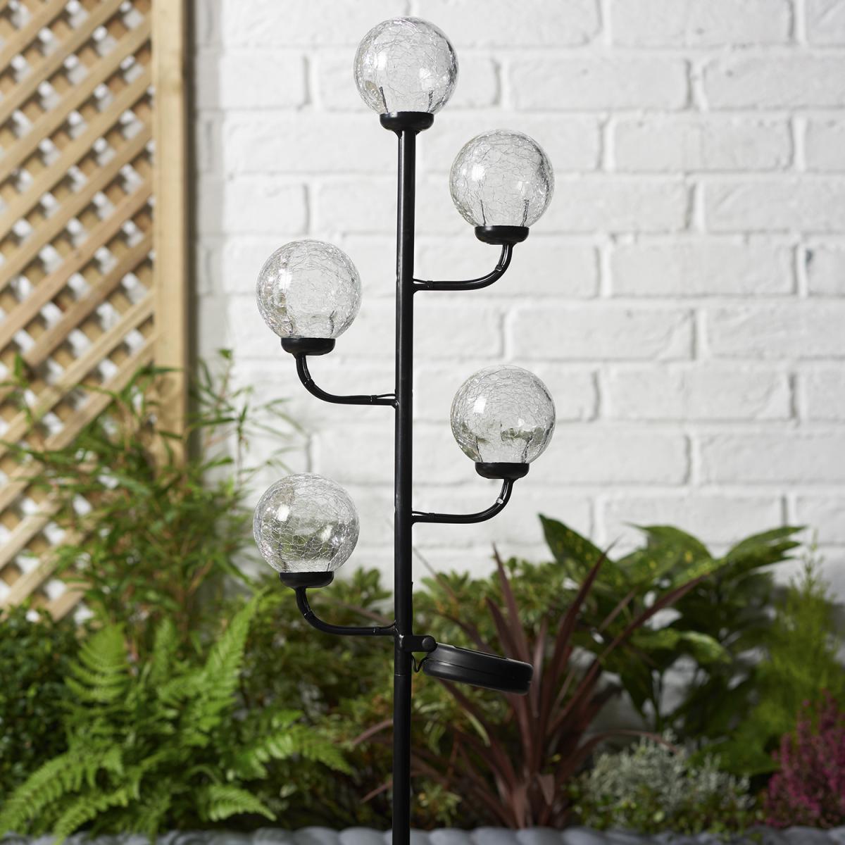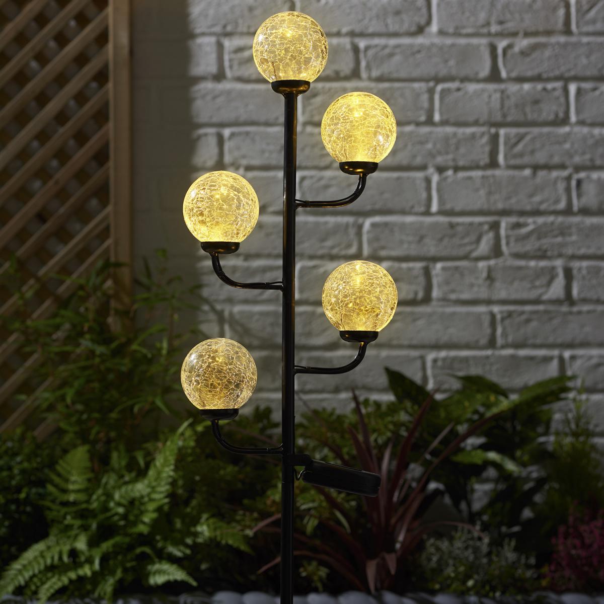 An impressive and eye-catching light, this Solar Crackle Ball Stake Light will add a striking touch of interest to any garden. Standing at over 80cm tall, this stake light features five branches topped with crystallised crackle balls. Powered by an attached solar panel, when the sun goes down the crackle balls will turn on and emit a warm white glow. This Solar Crackle Ball Stake Light is perfect for anyone who wants to bring some dramaticism into their garden, and it would be perfect for framing a doorway or signalling a path.